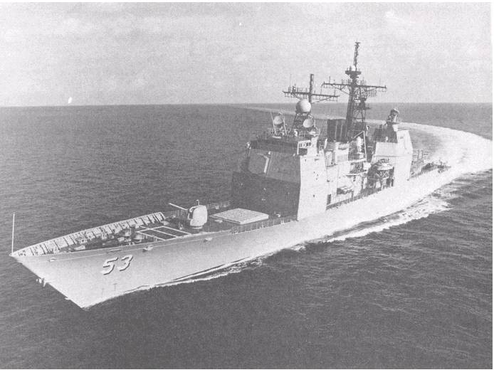 Figure 16-4. - Three-quarter aerial bow photograph of USS Mobile Bay (CG 53) underway. In either the upper left or upper right-hand corner of the clip sheet, type the following information: (1) name of the publication, (2) date of the publication and (3) the page number in which the clip appeared. Make a notation if the clip extended over more than one page. |