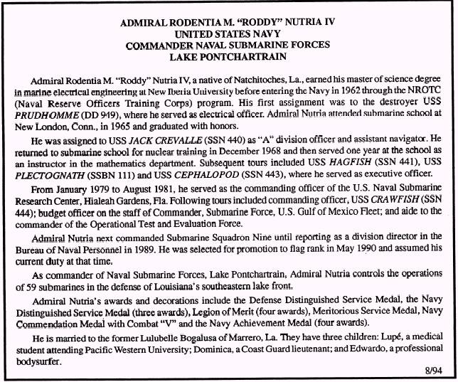 COMMAND AND FLAG OFFICER BIOGRAPHIES Biographies of command and flag officers (and C/MCs) are an important part of your public affairs office files. You will use them in media kits, welcome aboard booklets, external releases and other mediarelated products The standard biography has l-inch margins with either blocked or indented paragraphs. There are two spaces between paragraphs. The first paragraph of a biography mentions where the subject is from and lists educational achievements beyond high school (do not include the birth date). Also mention when officers received commissions and from what source. For an enlisted person, mention when he joined the service and where he attended basic training. Subsequent paragraphs usually outline (in chronological order) the person's career, listing significant jobs, accomplishments and educational achievements. Devote separate paragraphs to the person's current assignment and his medals and awards. The last paragraph should indicate the subject's marital status, spouse's name (including maiden name, if applicable) and place of birth. Names of children are included, and - if there is enough space - where they are attending college and serving in the military. Some additional points to remember when you write biographies are as follows: l Keep the civilian reader in mind. For example, Commander, Operational Test and Evaluation Force, Atlantic (COMOPTEVFORLANT) may be the correct way to phrase a military title, but it is much easier to understand if you write it like this: "Rear Adm. Clauster is the commander of the Operational Test and Evaluation Force, Atlantic." l Pay special attention to capitalization. If you are not saying "Commanding Officer Lemming," then commanding officer is not capitalized. The same rule applies to any other billet titles listed throughout the biography, such as executive officer, training officer and company commander. The rule of thumb for you to follow is this: if the title directly precedes the person's name, you capitalize it. However, if the title stands alone or follows the person's name, you use lowercase. Warfare specialties also are lowercase, as in this example: "He was designated a naval aviator in 1973 . ..." . Lowercase educational degrees. It is a "master's degree in aeronautical engineering." Also, one receives a degree from or earns a degree at a university. . Lowercase ranks unless you attach a name to them. One is "commissioned an ensign." l Use the person's present rank when you refer to him throughout the biography. l Omit street addresses. Keep your biographies to one page. If you can reproduce a photograph of the subject on the biography sheet, place it in the top left or right comer of the page and wrap the text around it. Note the month and year of the biography in the lower right-hand comer of the page. By doing this, you can distinguish the latest version of the biography from previous ones. The biography ultimately belongs to the person about whom it is written. He may have personal reasons for including or excluding certain personal information, so be accommodating. However, you should advise the subject of the style of the biography in a tactful manner. A sample flag officer biography is shown in figure 16-7.