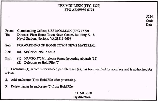 Figure 17-3. - Letter of transmittal. must complete block two of the release form. However, if a single mailing consists of 10 or more release forms, you must include a cover document called a letter of transmittal (fig. 17-3). A letter of transmittal series several purposes. It makes the transaction official and gives the FHTNC authority to process the story. In addition, it aids the Center in processing the material faster by indicating the type of material submitted, the general subject matter and the number of stories involved. Letters of transmittal must be signed by the CO or an officially designated representative (such as the PAO). Send only the original copy of the letter to the FHTNC. LEARNING OBJECTIVE: Interpret the policies regarding the submission of a hold file to the FHTNC. A hold file is a roster package of NAVSO 5724/1 release forms submitted by a unit when it deploys. The hold file provides a rapid means of generating timely and newsworthy releases about the accomplishments, achievements and travels of your crew, either individually or as a group. Hold files are maintained by the FHTNC for the length of the deployment and are normally returned to the command once the deployment is completed. If your unit is not deployed, you should maintain an updated roster package in your office anyway. In the event that your unit must deploy on short notice, you can submit a hold file with little effort. Any unit departing on an extended deployment (usually two months or longer) should forward a hold file to the Center. If your unit will be involved in exercises or special operations of shorter durations, seek the guidance of the FHTNC. |