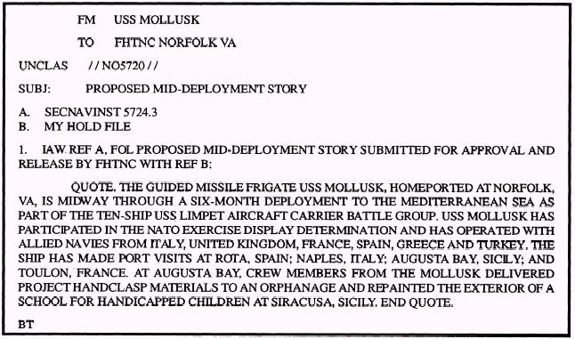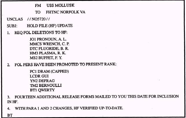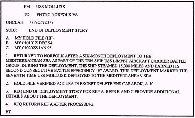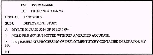Figure 17-4. - Hold file message. order by last name and accompanied by a letter of transmittal. We recommend that you include the deployment information or story in the letter of transmittal. NOTE: When you submit stories for release, the Center does not require strict adherence to journalistic style. Since the FHTNC is ultimately responsible for editorial action, all you need to include is a brief synopsis of the facts that answer the five Ws. Before the hold file is sealed and on its way to the FHTNC, you should make a copy of each release form and store each one of them in an appropriately marked office file. You hold file should be an exact duplicate of the one received by the Center. This is extremely critical, especially when you must change data or pull a release form in the event of a death or injury. PROCESSING THE DEPLOYMENT STORY When a unit deploys, the PAO or his representative normally sends a message to the FHTNC that contains the following information: l The authority for the FHTNC to process the deployment story. l The date the story should be processed (usually without delay). . Verification that the hold file is accurate and up-to-date. Once the message is sent, the Center can work on writing the deployment story, which will result in a release for all of the release forms in the hold file. An example of a hold file message to the FHTNC is shown in figure 17-4. SENDING STORIES BY MESSAGE Once the hold file is at the Center, you may send several different types of stories by naval message. The mid-deployment story (fig. 17-5) and end of deployment story (fig. 17-6) are good ways to get multiple releases for each release form submitted Further, you should pursue the types of stories mentioned earlier - those dealing with the military or personal achievements of individuals. Doing this in connection with your hold file is easy. For instance, say Lt. Cmdr. Nunez is awarded the Meritorious Service Medal. When you advise the Center of the award (and include amplifying information from the medal citation), Lt. Cmdr. Nunez's release f-will be pulled from the hold file and the story will be processed. The release form will then be returned to the file. UPDATING THE HOLD FILE Hold files have a 60-day life cycle. When you send a hold file to the FHTNC, the cycle begins on the day the Center receives it. At day 50, your unit will be sent a message advising that the file will be returned in 10 days unless it is updated. Each time you update your hold file, another 60-day cycle begins. The FHTNC considers an update as any communication regarding the hold file. It maybe a list of names to be deletes a list of release forms for persons who have reported to the command, or simply a
