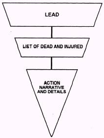 Figure 3-6. - Accident/disaster story structure. facts in any accident story are the number and identities of the casualties and the cause of the accident. This lead immediately satisfies the reader's initial curiosity about these facts, but more detailed explanations are saved for the body of the story. Since five people are involved in this accident, it would not be practical to list their names and complete identities in the lead. Therefore, they are included in the next segment of the story. Casualty List The casualty list contains the names, ranks or ratings, ages, next of kin, hometown addresses and other pertinent information available on the dead and injured. A casualty list for the above lead might be presented in the proceeding manner (listing should be in alphabetical order to facilitate readers in scanning the list for known names): Dead are: Seaman Apprentice David K. Becker, 19, son of Mr. and Mrs. Daniel M. Becker of 821 Sherman Dr., St. Louis, Mo. Seaman Jackson B. Painter, 22, son of Mr. and Mrs. Carl H. Painter of 680 Deamond St., Elmsdale, R. I., driver of the car. Injured were: Seaman Apprentice Bruce J. Burns, 22, son of Mr. and Mrs. Morgan J. Bums of Route 7, Nashville, Term., broken arms, shock. Fireman Milton M. Jackson, 20, son of Mr. and Mrs. Ralph J. Jackson of 4210 Florida Ave., Lexington, Ky., skull fracture, internal injuries. Engineman Third Class John C. Stole, 21, son of Mr. and Mrs. Alton H. Stole of 4109 American Ave., Long Beach, Calif., compound fractures, internal injuries. The dead are always identified first in the casualty list, followed by the injured In identifying the victims, it is again emphasized that all pertinent information related to them be included in the list. A newspaper near San Diego might use only the victims' names, ages and rates. The parents' names and hometown addresses might be cut because they have no local news value. The wire services, however, would want all the information. A story like this would be picked up and served to newspapers in the victims' hometowns. Names of the parents and their addresses are important. By including all the information in your releases, you leave its use up to the discretion of the media. It may also save you the trouble of later answering queries for additional information. Also, note that the driver of the car has been identified among those killed and that specific injuries have been listed for those injured. Most newspapers follow this practice. This eliminates the need for cluttering up the body of the story with these details later. If there are 10 or more casualties, the recommendation is that you place their names separately at the end of the story. The newspaper can treat the list as a sidebar or run the names in an adjoining box. Too many names in the casualty list cause a big break between the lead and the body, interfering with the story's progress. The use of a casualty structure has two distinct advantages for the newspaper. First, this treatment gives each name more prominence in the story because of the typographical arrangement. Each victim is listed separately. The reader does not have to ferret out their names from one long paragraph. The reader merely runs down the list quickly to see if there is anybody the reader knows. Second, the casualty list allows for easier handling in both the editorial department and the composing room. Let us say the previous story appeared in the first edition of a newspaper. By the time the fourth edition of the paper is ready to go to press, one of the more seriously injured victims dies. If the casualty structure is used, a complete revision of the story is not necessary. The editor makes a few minor changes in the lead and body of the story, then moves the name from the "injured" heading up to the "dead" heading in the casualty list. |