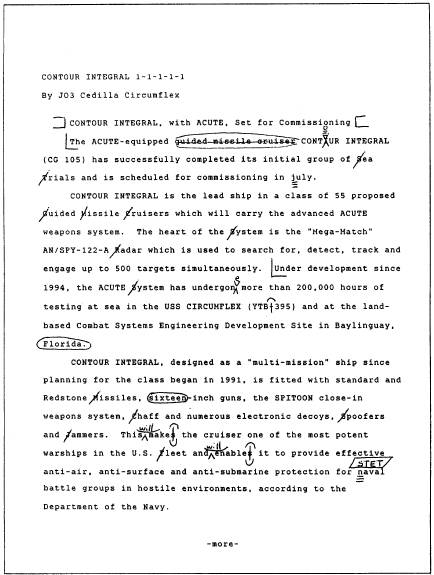 CHAPTER 6 COPY EDITING One of the most important and exacting jobs on any publication is that of written copy being given the final professional touch of accuracy. This job of catching and correcting inaccuracies before they can be printed and distributed is called copy editing. Readers may have a high regard for a newspaper that is carefully edited, but they quickly lose respect for one that is sloppy and full of errors. The copy. editor of both civilian and Navy publications represents the last line of defense against incorrect copy reaching the reader. It is the copy editor's job to make sure copy is not printed unless it meets certain standards. The copy editor is the guardian of both style and accuracy. Always on the alert for questionable facts, ambiguous statements and violations of office policy, the copy editor must catch errors in grammar, spelling, syntax, punctuation, capitalization, and so forth; cutout words or sentences that are not needed; and add copy when necessary for clarity, emphasis or continuity. Another responsibility of the copy editor is to restore objectivity to a story in places where a writer may have editorialized, quoted out of context or inserted an opinion without attribution to a source or pertinent authority. Also, the copy editor is constantly alert for statements of a libelous or slanderous nature. (Libel and slander are covered in Chapter 10.) The copy editor of a civilian newspaper has an additional function of assigning headlines for the edited stories. Navy copy editors, unless they are editing stories for use in ship or station newspapers, have no responsibilities in this area. They could hardly be expected to know the styles, formats and individual editorial needs of all the newspapers that receive news releases from a public affairs office. It is, however, sometimes appropriate to put a brief heading on a story to identify its subject readily. Like any typical, beginning newswriter, the neophyte JO is dismayed to see his "literary masterpiece" chopped up, pasted back together again and scored with the copy editor's pencil. Nevertheless, two minds are usually better than one. Most experienced writers will admit that the final result, despite its mangled appearance, is abetter piece of writing. Security is of the utmost importance in the armed forces. The responsibility for security lies with every person who, in any way, handles a story, but the copy editor sometimes represents the last defense against a possible violation. If you have doubts about the security classification of any information you receive, check it with your security officer. This chapter acquaints you with the standard symbols and style used by the copy editor and explains the procedures, rules and guidelines of copy editing. The basic pattern of news style in this chapter follows the style of The Associated Press and United Press International. Most newspapers in the United States now use this style. The recommended guide for preparing military news is the latest version of The Associated Press Stylebook and Libel Manual. COPY-EDITING PROCEDURES LEARNING OBJECTIVE: Identify the basic guidelines of copy editing. Copy editing follows a set system of procedures. To be absolutely accurate, you should read each story in the following manner: Read the story quickly to grasp its meaning and note its arrangement. Read the story more slowly and more thoroughly to correct every mistake and to add or delete material as necessary. Read the story again to check the copy editor's own corrections. The final check is also intended to make sure that no new errors occurred in copy editing and that the story reads smoothly. If the story contains too many mistakes and it appears obvious that copy editing will not improve it, the story goes back to the originating JO for rewriting, or in the case of copy received from outside sources, to a rewriter.