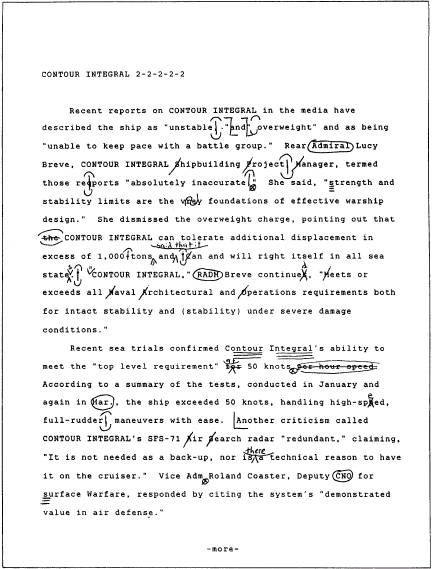 Figure 6-1. - Copy-edited story. PREPARING THE ROUGH The original copy of a story is known as a rough (fig. 6-l). Normally, it is typed double-spaced on only one side of the paper. In general, a JO follows the same format in typing a rough as in preparing a finished Navy news release. It does not have to be as neat, however, and may include Penciled-in corrections, additions or deletions, as necessary. The rough obviously does not need the letterhead information usually carried on a release ready for dissemination. It is a recommended practice in large offices for the author's last name to appear on the rough. This, of course, enables the copy editor (usually the PAO or the senior JO) to identify the writer. USING SYMBOLS To prepare copy for reproduction in its final form, the copy editor uses a special set of shorthand symbols to indicate any required changes (fig. 6-2).