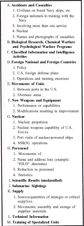 AUTHORITY FOR RELEASING NAVY NEWS LEARNING OBJECTIVE: Identify the proper authority for the release of Navy news. When information previously limited to a controlled number of persons is made available to the general public, it is said to be "released." If this is done in formal written form, the document itself is termed a release, or a news release. Officers in command of all ships and stations, as well as senior commands, are authorized to release certain types of news without requesting advance approval from higher authority. News of purely local interest is the first of this type. However, there are certain cautions. All officers in command are responsible for keeping CHINFO and other concerned seniors informed of all events and actions when any possibility exists that the national news media may become interested. There are also special procedures for handling news releases relating to members of Congress and civic officials. Spot news, including announcements or answers to queries of an emergency nature, where delay in issuing information would be harmful to the best interests of the Navy, is releasable without advanced approval of higher authority. Categories of news releases for which local release is not authorized, without prior approval of higher authority, are covered in detail in PA Regs. A partial list of these categories is included in figure 7-1. In some cases the PAO is authorized by the officer in command to release certain news items, such as "hometowners" and news of a purely routine nature. Release of information by any command is carried out by, or with, the assistance of the command PAO. Offices or divisions within a command cannot release information to the public without consulting the PAO. For a complete study on the proper release of information through channels from the heads of