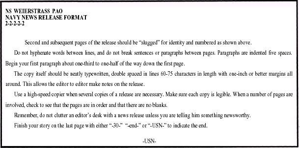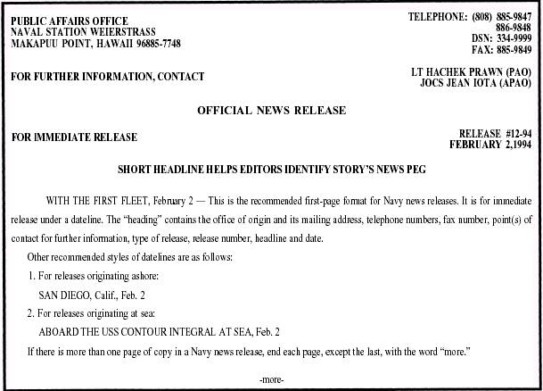 METHODS OF DISSEMINATING NAVY NEWS LEARNING OBJECTIVE: Determine the methods of disseminating Navy news. Navy news material, properly authorized for release, can be channeled to the media in several ways. The nine commonly used methods are as follows: * Standard Navy news release l Spot news announcements l Interviews l Background briefings l Feature releases l Advance releases l Personal appearances STANDARD NAVY NEWS RELEASE A Navy news release is an official Navy statement prepared in news story form. The enlisted journalist normally prepares and edits it, then the PAO, through the authority of the officer in command, approves the release. As a Navy journalist, you will work with the Navy news release more than with any other method of news dissemination. A well-prepared and edited standard Navy news release - placed in the hands of all interested media at the same time, supplying all with identical information - remains the most satisfactory method of releasing news. Most public affairs offices, particularly at larger commands, use a printed heading for their news releases. These are attractive and help members of the media identify the source of the release more quickly. However, they are by no means necessary. If a printed heading is used, keep it simple, informal, suitable and in good taste to cover all types of releases. The news value of the material, and not the packaging, is the most important consideration. A sample release format is shown in figures 7-2 and 7-3. Certain information, however, should always be included in the heading of a release. Make sure your release format includes the following items: l Name, address and ZIP code of the originating command l Office telephone numbers (including facsimile number) l Point(s) of contact for further information l Type of release l Release number l Short headline to identify the content of the release l Date of release News releases should be double-spaced, typed on only one side of a sheet of paper and legibly reproduced. Official directives regarding economy in duplication on both sides of the paper do not apply to news releases. Timing of Navy News Releases The timing of news releases is almost as important as their content. An improperly timed handout maybe lost in the media editor's in-box simply because it is poorly timed. Most Navy stories are distributed For Immediate Release. This authorizes the media to use the story as soon as it is received. Occasionally, however, it is necessary to distribute a story on a Hold For Release basis. This tag, along with the authorized date of release, is attached to important feature stories. It is usually typed in the spot where For Immediate Release appears in the figure 7-2. Assume that the CNO accepts a speaking engagement in your city. If an advance copy of the speech is available, it may be released to news media on a Hold For Release basis. This would give news media several advantages. First, reporters covering the event would not have to take notes of the speech. They would merely check their future release to make sure the CNO followed the text. Second, television or radio people may not want to record the entire speech. With an advance copy of it in their possession, they could tape only key portions. Third, if the speech is important enough, newspaper editors may decide to publish it verbatim. The advance copy would permit them to set the speech in type beforehand so the speech could be printed immediately after it was delivered.