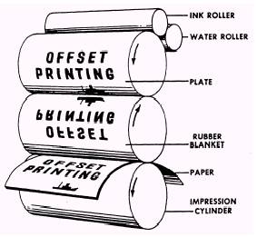 Figure 8-1. - The process of offset lithography. inked image. The blanket cylinder "offsets," or transposes, the image to the paper which is carried through the press and pressed against the blanket by an impression cylinder. This process is shown in figure 8-1. PHOTO-OFFSET COPY Let's now evaluate what must be done to prepare copy for photo-offset equipment. The set copy is mounted, along with line art, on a paste-up (layout sheet) for photographing. The way art and type are mounted on the paste-up has a great effect on the quality of the finished product. Take care to avoid shadows and wrinkles. If possible, make the paste-up to the actual size of the newspaper. In some cases, a Navy editor may only indicate the sizes and positions of the various elements on the layout sheet and then let the publisher position them accordingly. However, you can save much time and effort when you make the complete paste-up yourself. It is easier for' you to cut and paste the paper than it is for the publisher to work with the photographic negatives and positives for final assembly. You will need the following items for the paste-up operation: A drafting board or table A prepared paste-up (layout) sheet A "T" square A steel straightedge Rulers Rubber cement Erasers An india ink set A cutting edge (X-acto knife or single-edge razor blade) Light blue (nonphoto blue) lead pencils Scissors A scale system to determine photo-reproduction size A printer's rule |
