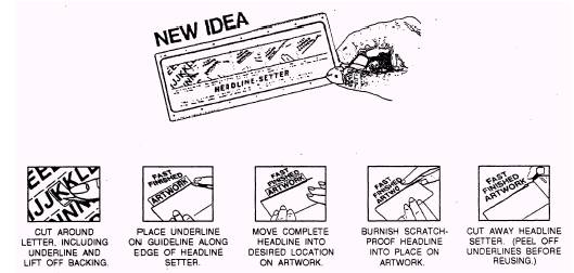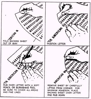 Figure 8-3. - Presure-transfer lettering. paste-up in light-blue pencil then to position each letter in its proper place. Pressure-transfer lettering (fig. 8-3) is similar to paste-up lettering, since the letters of the alphabet are printed on acetate sheets. However, instead of cutting the letter out of the acetate sheet and attaching it to the paste-up, you simply move the sheet until the desired letter is in the proper position; then you rub the front of the sheet with a pencil or burnisher. When pressure is applied, the letter transfers from the back of the acetate sheet directly to the paste-up. You can remove a pressure-transfer letter with an ordinary pencil eraser, X-acto knife or masking tape. One disadvantage of using printed lettering sheets is that when you run out of frequently used letters, you have to acquire a new sheet. In addition, there are several "headliner" machines on the market that produce display matter photographically. The heads are set in long lines or strips that are then trimmed and pasted in place on the layout. Headline preparation is covered in Chapter 9. Photographs cannot be pasted onto the layout with type and line art because they must be photographed through a halftone screen. Therefore, they are often shot as separate negatives and then spliced into the master (line) negative of the page before the plate is made. With this method, only the shape and size of the halftone are indicated on the page layout. This is accomplished in several ways. The simplest is to "mask out" the area where the halftone will be positioned with india ink or black paper. Another way is for you to square off the space on the paste-up, putdown a piece of red adhesive film and cut it to fit the halftone area. The camera photographs the red the same as black. The red cellophane is more expensive, but it is much easier to use and often more accurate. Red or black space on the paste-up appears as clear space on the negative. It serves as a window through which the platemaker can accurately position the halftone negative into the line negative. Another method is to print the photograph to size, screen it and paste it in place on the layout sheet before making the page negative. Either method may be used at the publisher's discretion. However, your concern will be with submitting the artwork to the publisher in the proper form with the appropriate guidelines explaining your requirements, rather than the mechanics of printing. There are three ways to submit your photographs to the publisher. They are as follows: 1. When photographs are printed or cropped to the exact size they are to appear in the publication (a "one-to-one shot" in printing terminology), they may be mounted in their predetermined position on a separate layout sheet. Therefore, you will submit two paste-ups - one containing the line work and the other the halftones. 2. When photographs are to be reduced or enlarged, crop or scale them to indicate the desired size. Cropping and scaling will be covered later in this chapter. 3. When a halftone is to be of an irregular shape, the preparation procedure is somewhat different. In this case, a "window" for the platemaker is needed. You can make the window as follows: paste the actual photograph in position on the line paste-up, attach a clear acetate sheet over it, then, with red or black opaque paint, carefully paint in the area indicated by the outline of the photograph under the acetate. There is also a special material - a red-coated acetate - that can be used to outline the illustration. This red is translucent and can be scraped away from the outside outline of the halftone, leaving the red shape for the camera to record as the window. If the job is very complicated, it is better for you to let the publisher do that kind of preparation. A good publisher will advise you on the best method of preparing photographs for photo-offset printing, Be sure to protect your paste-ups carefully. If they are damaged - or if they get dirty - you may have to start over. It is a good idea to cover them with a tissue overlay and to protect them between layers of cardboard when taking them from one place to another. |