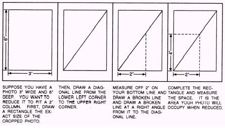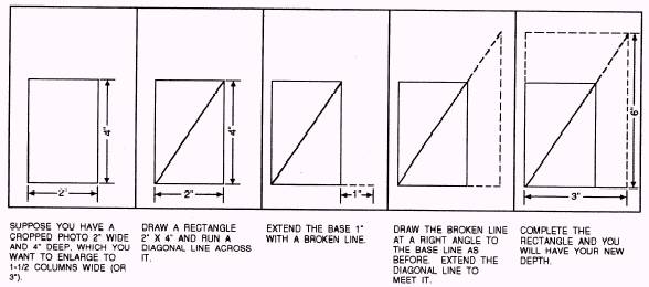 SCALING Scaling is the act of either enlarging or reducing a cropped photograph or artwork to fit a hole on a newspaper page. Since you must first know the cropped dimensions, you cannot scale a photograph before you crop it. Once you know the dimensions, then you can scale the photograph to fit that hole snugly. In scaling a photograph, you are trying to determine either the reproduction depth or the reproduction width. As you enlarge or reduce the photograph to reproduction width, the reproduction depth will change proportionately. Consequently, when you scale for reproduction depth, the reproduction width will change proportionately. The two simple ways to scale a photograph or artwork to size areas follows: l The diagonal method l The proportional scale method The Diagonal Method The diagonal method of scaling a photograph or artwork is a mechanical procedure that does not require great mathematical skill or special tools. Diagonally