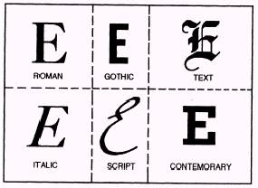 TYPOGRAPHY Typography is the art of printing with type. It involves the style, arrangement and appearance of the printed page. As editor of a ship or station newspaper, you should be familiar with a few important type-related terms. Printers' Measurements Type size is measured in points. One point is approximately one seventy-second of an inch. Twelve points equal one pica (remember - six picas equal one inch). Points are used to measure the height of a letter of type. The width of a line of type is given in picas. Most newspaper columns are about 12 picas (2 inches) wide. Type ranges in size from 3 to 120 points. Your stories will usually be printed in 8- or 10-point type. Most of your headlines will range from 12 to 36 points. The depth of a column of type or art (measured down the page) is given in inches. A column inch is one column wide and 1 inch deep; a photograph two columns wide and 3 inches deep occupies six column inches. Type Classification Did you ever stop to think how many different kinds of handwriting you come across in a single day? Some are large and bold, some are weak, some small, some clear and some are almost illegible. Type styles, called typefaces, are much the same. The first concern of selecting a type is, of course, clarity. Type must be legible. However, there is more to it than that. Like handwriting, typefaces reflect certain characteristics, such as refinement, dignity, boldness or strength. Properly used, they can convey the feeling or mood of a message. They maybe warm, brisk, dignified, modern or old-fashioned - whatever is needed to emphasize or suggest the thoughts expressed in copy. Type can be used to attract the reader's attention. The use of large boldfaces is one of the most effective ways of stopping the eye. Large, boldface type, however, is difficult to read. It should be limited to a few words and should be followed by smaller, more legible faces that invite reading. Most kinds of type have both capitals and small letters. Publishers use the term uppercase for capitals and lowercase for small letters. These terms originated in early printshops where type was set by hand. The less-used capital letters were stored in an upper storage. case and the frequently-used small letters in a lower one. As early as the seventeenth century, publishers knew they had to organize their typefaces efficiently. They arranged their typefaces into main type classes. The six main classes of type (fig. 8-15) areas follows: . Roman o Gothic l Text . Italics l script l Contemporary