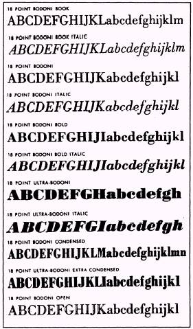 Figure 8-16. - Various typefaces in the Bodoni family. Type Families From classes, type is further categorized into typefaces that are similar in design, though not exactly alike. These groups are called type families. Each type family has a name and a certain basic family resemblance. Many type families are named for their creators, such as Bodoni and Goudy. Some names come from regions or nations: Caledonia and Old English. Some type families include dozens of typefaces, all different in some way, yet all having general characteristics that unmistakable y identify them as members of their particular family, such as the Bodoni family in figure 8-16. Type Series The next type category refers to the weight, width and angle of type. This category is called type series. When a series carries only the family name, with no adjectives indicating variations in width, weight or angle, assume that the type is normal. The usual distinction is between big letters (called display or headline type) and small letters (called body or text type). Type Font Type font is the next category and has all the letters, numbers and characters necessary to set copy in one size of type. However, a modern newspaper uses either one or two families of compatible type to achieve variety in the series choice and point size. |