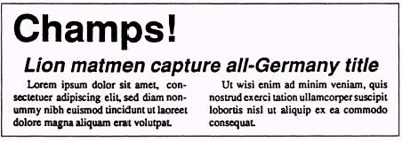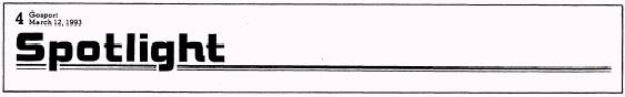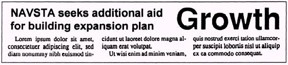 Figure 9-12. - Novelty head. TRIPOD HEAD The tripod head (fig. 9-10) is a single, short line of larger type set to the left of two lines of smaller type. The tripod portion (larger wording) should be twice the size of the definition or main headline. For example, a 36-point tripod would dictate that the main head be set in 18-point type to give the true tripod appearance. Punctuation in the form of a colon is required when the tripod conveys a separate thought. WICKET HEAD The wicket head (fig. 9-1 1) is a tripod in reverse (short line of larger type set to the right of two lines of smaller type). The colon is not used in the wicket. Although it is seldom used, on occasion, you may consider it to vary your newspaper design. NOVELTY HEAD The novelty head (fig. 9-12) features typographical tricks, such as setting part of the head upside down, using an ornate typeface or substituting artwork as characters. Use the novelty headline sparingly with appropriate feature articles. Overuse of this headline may lead to your readership questioning the credibility of the newspaper. |