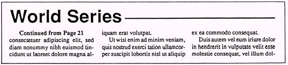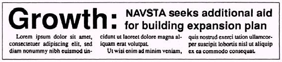 Figure 9-9. - Hammer head. There are countless variations of headline styles, all of which are viewed in terms of their visual impact when used with basic headline styles. Some of these variants are explained in the following text. STANDING HEAD The standing head (fig. 9-7) is essentially a label used for regular or recurring content, such as sports and chaplains' columns. It does not change from issue to issue. JUMP HEAD The jump head (fig. 9-8) is designed to help the reader find a portion of a story continued from another page. The jump head uses one or two key words from the headline that introduced the story. It is set flush left followed by the words "Continued from Page ##," usually set in boldface body type (it also can be set in italic). A two-point rule maybe used to extend from the side of the head over the width of the article. HAMMER HEAD Often called a reverse kicker, the hammer head (fig. 9-9) is set twice the size of the main head, set flush left and is no wider than half the width of the headline area.