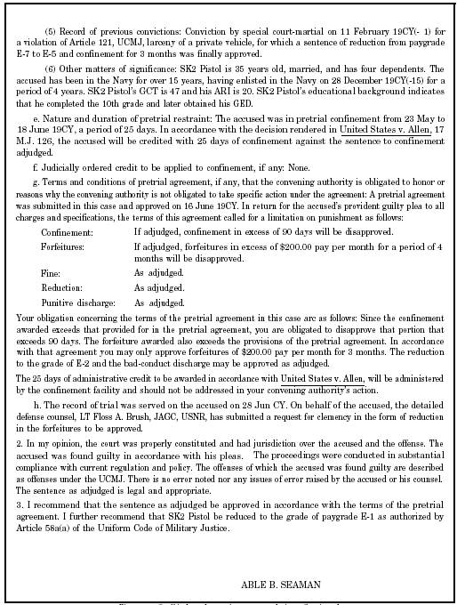 Figure 8-6.-Detailed defense counsel's response to staff judge advocate's recommendation. and usually leads to trouble unless the drafter is experienced. The CA may recall and modify any action taken by him or her at any time before it has been published or before the accused has been officially notified. In addition, in any SPCM not involving a BCD or an SCM, the CA may recall and correct an illegal, erroneous, incomplete, or ambiguous action at any time before completion of review by a judge advocate, as long as the correction does not result in action less favorable to the accused than the earlier action. The CA must personally sign any supplementary or corrective action. If any findings of guilty are disapproved, the action must state that. If a rehearing is not ordered, the affected charges and specifications will be dismissed by the CA in the action. If a rehearing or other trial is directed, the reasons for the disapproval of the findings will be set forth in the action. The action will state whether the sentence adjudged by the court-martial is approved. If only part of the sentence is approved, the action will state which parts are approved. A rehearing may not be directed if any portion of the sentence is approved. The action will indicate, when appropriate, whether an approved sentence is to be executed or whether the execution of all or any part of the sentence is to be suspended. No reasons need to be stated. If the CA orders a sentence of confinement into execution, the CA will designate the place of confinement in the action. If a sentence of confinement is ordered into execution after the initial action of the CA, the authority ordering the execution will designate the place of confinement. When a record of trial involves an approved sentence to death, the CA will, unless any approved sentence of confinement has been ordered into execution and a place of confinement designated, provide in the action for the temporary custody of the accused pending final disposition of the case on appellate review. Whenever the service of the sentence to confinement is deferred by the CA before or concurrently with the initial action in the case, the action will include the date on which the deferment became effective. The reason for the deferment dots not have to be stated in the action. When the military judge directs that the accused receive credit for illegal pretrial confinement, the CA will so direct the credit in his or her action. The CA will include in the action any reprimand that the CA has ordered executed. If the accused was awarded a punitive discharge or confinement in excess of 90 days (awarded in days) or 3 months (awarded in months), the CA's action must address the issue of automatic administrative reduction. In his or her sole discretion, the CA may remit the automatic reduction, or he or she may retain the accused in the paygrade held at the time of sentence or in an intermediate paygrade and suspend the automatic reduction to paygrade E-1 that would otherwise be effected under Article 58a(a), Uniform Code of Military Justice (UCMJ). Additionally, the CA may direct that the accused serve in paygrade E-1 while in confinement but be returned to the paygrade held at the time of sentence or an intermediate paygrade upon release from confinement. Failure of the CA to address automatic reduction will result in the automatic reduction to paygrade E-1 on the date of the CA's action. Figures 8-7, 8-8, 8-9, and 8-10 show examples of the CA's action. Figure 8-7 illustrates approval of part of the sentence and partial order of execution of the sentence awarded at trial. Figure 8-8 illustrates a CA's action on an acquittal. Figure 8-9 shows an example of a CA's action when the sentence adjudged by the court is approved by the CA and all but the BCD is ordered executed. Figure 8-10 illustrates a CA's action wherein the sentence awarded at trial is approved and ordered executed. These are the most common forms of the CA's action. However, as stated earlier, appendix 16, MCM, contains sample forms for action and should be referred to when drafting the action of the CA. After taking action, the CA will publish the results of the trial and the CA's action in a legal document called a promulgating order. |