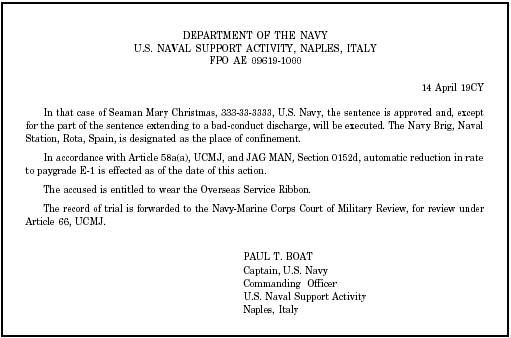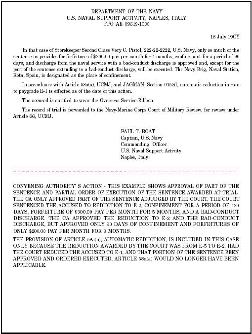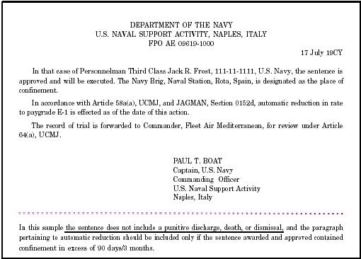 Figure 8-10.-CA's action. Sentence awarded at trial approved and ordered executed. initial promulgating order is set forth in appendix 17, MCM, and illustrated in figure 8-11. The order will set forth the following: The type of court-martial and the command by which it was convened The charges and specifications, or a summary thereof, on which the accused was arraigned The accused's pleas The findings or other disposition of each charge and specification The sentence, if any The action of the CA or a summary thereof A promulgating order will bear the date of the initial action, if any, of the CA. An order promulgating an acquittal, a court-martial terminated before findings, a court-martial resulting in a finding of not guilty only by mason of lack of mental responsibility of all charges and specifications, or action on the findings or sentence taken after the initial action of the CA will bear the date of its publication. The promulgating order will state the date the sentence was adjudged, the date the acquittal was adjudged, or the date the proceedings were otherwise terminated. All initial and supplemental promulgating orders will be distributed as follows: l Original to be attached to the original record of trial. l Duplicate original to be placed in the service record of the accused, unless the court-martial proceedings resulted in acquittal of all charges, disapproval of all findings of guilty, or disapproval of the sentence by the CA when no findings have been expressly approved. Send this copy to the personnel support activity detachment maintaining the accused's service record. l Duplicate originals or certified copies: