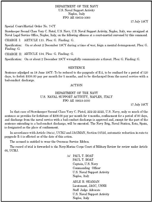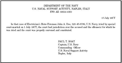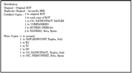 Figure 8-11.-Promulguting order-Continued. a. Three copies to be attached to the original record of trial. (Only one need be attached in those SPCMs in which the approved sentence dots not include an unsuspended or suspended BCD.) b. One copy to be attached to each copy of the record of trial. c. Two copies to the CO of the accused if a brig or confinment facility is designated as the place of confinement; three copies if a disciplinary command is designated as the place of confinement. These copies should accompany the records of the accused to the place of confinement. d. One copy to Commander, Bureau of Naval Personnel (PERS-06 in the case of officers, PERS-83 in the case of enlisted). e. One copy to the OEGCMJ over the accused at the time of trial, and one to the current OEGCMJ over the accused (if different). The OEGCMJ will be identified by the command name. f. One copy to the type commander of the accused at the time of trial. The type commander will be identified by the command name. . Duplicate originals, certified copies, or plain copies: a. One copy to the accused. b. One copy to the CO of the naval legal service office (NLSO) where the accused was tried. c. One copy each to the military judge, the TC, and the DC of the court-martial. d. One copy to the CA and, if the accused was serving in a command other than that of the CA at the time of the alleged offense, one to the command in which he or she was then serving. c. One copy to each appropriate subordinate unit and any other locall distribution desired. f. In addition to the distribution requirements stated previously, make sure the following distribution is made when the accused is a Navy officer: (1) Copy to Officer in Charge, Personnel Support Activity Detachment, Building 29, Offutt AFB, Omaha, Nebraska 68113, if the U.S. Disciplinary Barracks, Fort Leavenworth, Kansas, is designated as the place of confinement. (2) Copy to the Defense Finance Accounting Service (DFAS), Special Claims Department (Code 4311), Cleveland Center, Cleveland, Ohio 44199-2058, if the sentence includes forfeiture of pay that has been approved by the CA. Supplemental Actions and Supplemental Promulgating Orders Action on the case occurring after the initial promulgating order has been published will be taken by issuing a supplemental action and a supplemental promulgating order. Appendix 17, MCM, 1984, provides the necessary forms. |