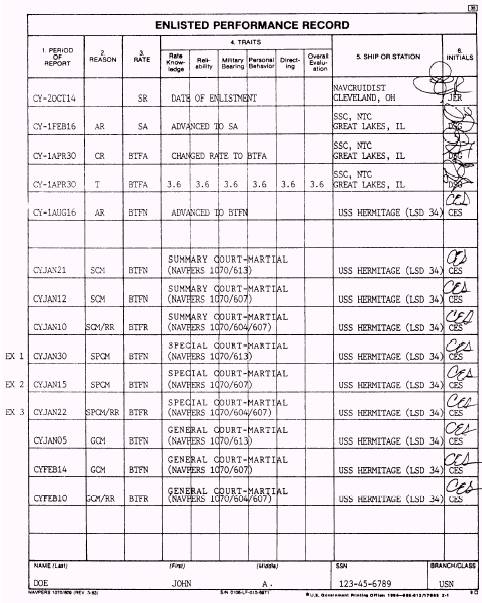 Posttrial Service Record Entries When an enlisted member is tried and convicted by court-martial, and a guilty finding is approved by the CA, entries in the member's service record must be made setting forth the details of the trial. When you are trying to determine which service record entries are required to properly document the results of trial, there are several things to consider. There are several types of punishment that the court could adjudge. Some of these punishments will affect the accused's pay and some will not. The types of punishment that affect an accused's pay are (1) reduction in rate; (2) forfeiture of pay; and (3) fine. The types of punishment that do not affect the accused's pay are (1) confinement; (2) hard labor without confinement; (3) restriction; (4) admonition or reprimand; and (5) punitive discharge (DD or BCD). You must also realize that even though the CA has approved a sentence, or any part of a sentence, he or she may still desire to suspend that sentence or any portion of that sentence. If the CA does suspend a sentence, or any portion thereof, it may have a bearing on the type of service record entries you will be required to make. Notice that the service record pages that are required are pages 4, 7, 9, and 13. However, not all these pages will be used in every case. You will have to determine when any particular entry is required based upon the facts of the case. You have already learned the basic preparation requirements for these service record pages in chapter 6. The only difference now is you will prepare them for approved court-martial sentences vice NJP results. A few general rules apply for the preparation of these documents. Page 4 entries 1. If the sentence, as approved and ordered executed by the CA, includes a reduction in rate, you will prepare a page 4 entry. 2. If the sentence includes a reduction in rate that has been approved, but, instead of being ordered executed, has been suspended for a specified period of time by the CA, then you will not prepare a page 4 entry at this time. 3. If the reduction in rate has been suspended by the CA for a specified period of time, and during that period of time the accused violates the terms of the suspension, the CA will most likely order the suspended reduction in rate be executed. This is known as vacating a suspended sentence. When this happens, you will prepare a page 4 entry. The effective date and the time in rate date would be the date that the CA ordered the suspended reduction in rate vacated. A sample of a completed page 4 is shown in figure 8-12. Page 9 entries You will always be required to make a page 9 entry to document that an accused has been to a court-martial if that court-martial resulted in a conviction. General rules for entries on page 9 include the following: 1. Block 2-Reason: If the accused was reduced in rate, you will type the letter abbreviation of the type of court-martial followed by a slash and then type RR. 2. Block 4-Traits: Always refer to all service record pages where an entry was made to reflect an approved sentence. Figure 8-13 illustrates three examples of how to annotate a page 9. You would use the first sample if the sentence, as approved by the CA, did not include confinement and did not affect the accused's pay-in other words, there was no reduction in rate, no forfeiture of pay, no fine, and no confinement. You will use the second sample if the sentence, as approved by the CA, did include confinement and/or did affect the accused's pay, but did not include a reduction in rate. Use the third type of sample when the sentence as approved by the CA includes a reduction in rate. As the samples show, the choices of possible page 9 entries would be the same for an SCM or a GCM.