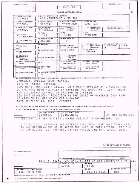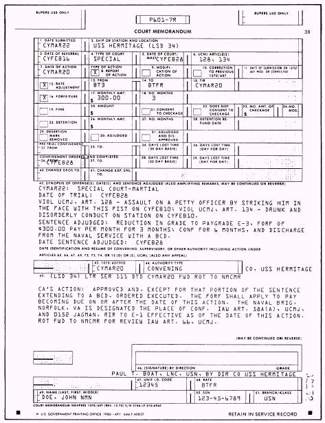 Figure 8-16.-Court Memorandum, NAVPERS 1070/607-CA's action that approved and ordered executed the sentence awarded with the exception of the BCD.