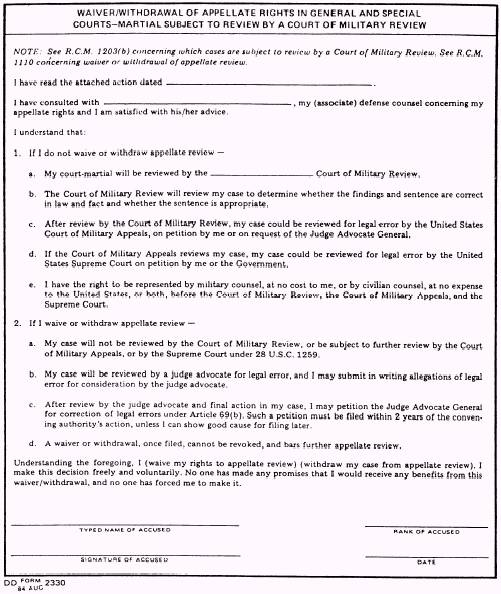 Figure 8-18.-Waiver/Withdrawal of Appellate Rights in GCM and SPCM Subject to Review by a Court of Military Review, DD Form 2330.