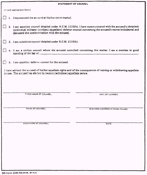 Figure 8-18.-Waiver/Withdrawa1 of Appellate Rights in GCM and SPCM Subject to Review by a Court of Military Review, DD Form 2330-Continued.