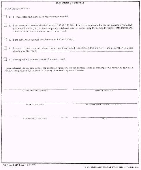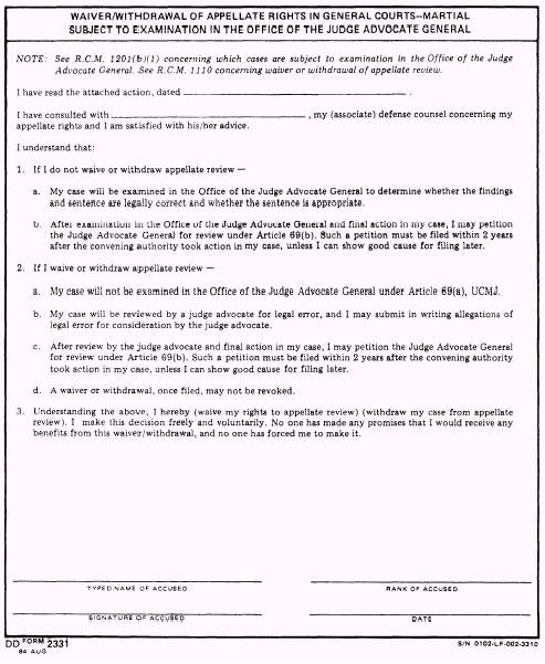 Figure 8-19.-Waiver/Withdrawal of Appellate Rights in GCM Subject to Examination in the Office of the Judge Advocate General, DD Form 2331.