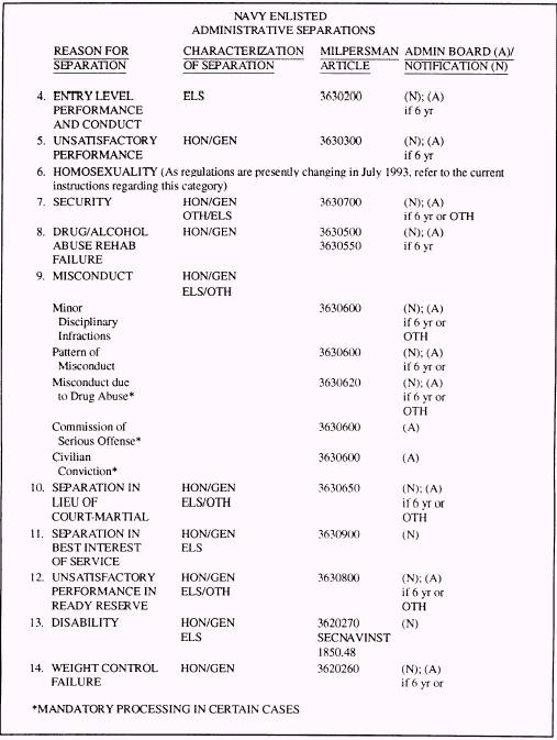Figure 9-1.-Navy enlisted administrative separation-Continued. other early-out programs. Also, acceptance of an active duty commission or permanent appointment, or acceptance into a program; for example, officer candidate school (OCS), leading to an active duty commissioner appointment will result in a separation under this article. The member must submit an official letter of request for separation via his or her commanding officer (CO) to the Chief of Naval Personnel (PERS-28). The request must include a copy of the acceptance or appointment letter from the officer program and a copy of the reporting requirement for the officer program. The Chief of Naval Personnel makes final determination on the member's request. The member will receive an honorable, general, or ELS characterization of service. For additional guidance on separation processing by reason of selected changes in service obligation, refer to the MILPERSMAN. EXPIRATION OF ENLISTMENT OR FULFILLMENT OF SERVICE OBLIGATION OR EXPIRATION OF TOUR OF ACTIVE SERVICE Unless voluntarily or involuntarily retained beyond normal expiration of term of service, enlisted members will be discharged upon normal date of expiration of enlistment, extension of enlistment, or period of induction, provided the member does not have additional service obligations. The member will receive an honorable, general, or ELS characterization of service. For additional guidance on separation processing by reasons of expiration of enlistment, fulfillment of service obligation, or expiration of tour of active service, refer to the MILPERSMAN. |