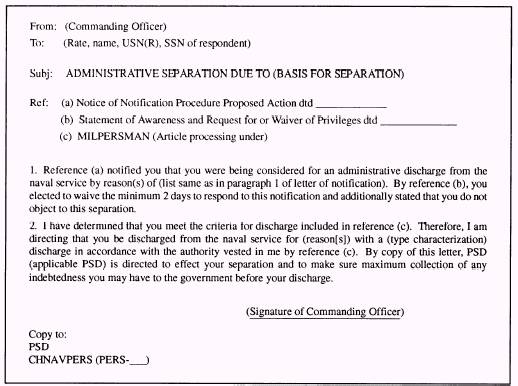 ACTION OF THE OFFICER EXERCISING SPCM CA Officers exercising SPCM CA are delegated authority to separate enlisted personnel with honorable, general, or entry level discharges when the member does not object to separation for the following reasons: l Designated physical or mental conditions (somnambulism, enuresis, personality disorder, and excessive height) l Weight control failure l Dependency or hardship l Pregnancy or childbirth l Surviving son or daughter l Erroneous enlistment l Fraudulent enlistment l Entry level performance and conduct l Unsatisfactory performance l Homosexuality (where no OTH is recommended) l Drug abuse rehabilitation failure l Alcohol abuse rehabilitation failure In any case that must be initiated under the administrative board procedure vice the notification procedure an SPCM CA is delegated authority to separate the member when (1) an administrative discharge board recommends separation with a general or honorable characterization, (2) the member does not object to the discharge, and (3) the characterization is consistent with guidelines in the MILPERSMAN. COs with SPCM CA effect the discharge by issuing a letter to the respondent directing the discharge. Figure 9-3 is a sample letter that a CO with SPCM CA may issue a respondent to effect the discharge. Send a copy of this letter along with all pertinent documents to the Chief of Naval Personnel for inclusion in the member's permanent record. If the CO does not have SPCM CA or the member objects to the separation, the case must be referred to the Chief of Naval Personnel for final determination. This is accomplished by either message submission or a standard letter of transmittal. Message Submission Do not send cases by message in which an administrative board was held or the CO is the separation authority. While message submission hastens the process and is encouraged, COs must use discretion in determining which cases should be submitted via message. Discretion is appropriate in cases wherein the basis for processing is a character trait or physical or mental deficiency that if it were to become known by the command personnel could create dissension or further personal embarrassment to the member. Due to the limitations of the message format, commands processing USNR-R members and members being processed in the best interest of the naval service are not authorized to submit cases via message. Message transmission will be sent by routine precedence in the format provided in the MILPERSMAN, Article 3640200(11). Make sure all information required is included. Include your servicing personnel support detachment (PSD) as an information addressee. A message submission must be released by either the CO or the acting CO since it is taking the place of a letter of transmittal. File a copy of the released message in the member's service record. When you submit an administrative separation case by message, send the supporting documentation
