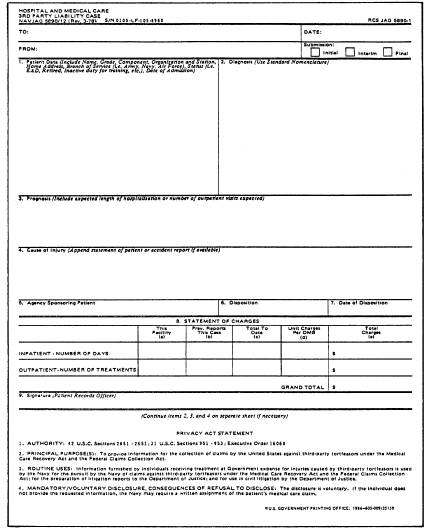 Figure 12-5B.-Sample NAVJAG Form 5890/12, Report of Hospital and Medical Care-Third Party Liability, Supplemental Statement (back). claim cannot be collected locally, referral to the Department of Justice for litigation is possible, but this must be done by JAG. MEDICAL PAYMENTS INSURANCE COVERAGE Government claims for medical care normally are directed against the tortfeasor and recovery is obtained either directly from him or her or the insurance carrier. There are, however, other potential sources for recovery of medical care expenditures, depending upon the circumstances involved. One such potential source is medical payments insurance coverage. Under the provisions of certain automobile insurance policies, an insurer may be obligated to pay the cost of medical care for injuries incurred by the policyholder, his or her passengers who are riding in the insured vehicle, or a pedestrian who is struck by the insured vehicle. Assuming such coverage exists (and it is the claims officer's responsibility to determine if it does), medical payments clauses apply regardless of who was at fault and the United States may be entitled to recover as the provider of medical care. It is extremely important to note that recovery has been allowed, based on one of two theories: (1) that the United States is insured under the medical pay provisions of the insurance policy or (2) that the United States is a third-party beneficiary of the insurance contract. Recovery is not based upon the MCRA, but under the terms of the individual insurance policy. UNINSURED MOTORIST COVERAGE Another potential source of recovery of medical care costs is the uninsured motorist coverage provisions of the typical automobile insurance policy. If an injured service member has obtained such coverage, and the tortfeasor is uninsured, the typical uninsured motorist coverage clause provides for payment to the policyholder of those sums that he or she would have been able to recover from the tortfeasor, but for the fact that the tortfeasor was uninsured. Like medical payments insurance coverage, the right of the United States to recover is based upon the terms of the insurance contract and not upon the MCRA. If the term insured includes any person, then the courts have generally held that the United States is entitled to recover. NO-FAULT STATUTES The recovery of the United States under the MCRA in states that have enacted no-fault statutes will be determined by the language of the statute. It is necessary to determine if the United States is within the terms of the statute so as to be entitled to recover for medical care provided. If the state statute eliminates a cause of action against the tortfeasor, then the only probable source of recovery is under the injured party's no-fault insurance. If the United States is excluded and has no cause of action, then there maybe no recovery in the particular case. AFFIRMATIVE CLAIMS AGAINST SERVICE MEMBER TORTFEASER The United States may not assert an affirmative claim against a service member or employee who, while in the scope of employment, damages government property or causes damage or injury for which the United States must pay. Consideration, in the case of gross negligence or willful and wanton acts, should be given to whether such actions took the service member or employee outside the scope of employment. CLAIMS MANAGEMENT As a senior LN, your knowledge in claims accounting procedures must be thorough. You need to be familiar with the many budget projects out of which claims are paid. The following will present an overview of how to manage a claims accounting system. MANAGING NAVY CLAIMS FUNDS Managing claims funds should be no more difficult than taking care of a checking account. Checks (vouchers) and deposits (case collection vouchers and fund authorizations) arc recorded in a checkbook (memorandum accounting logbook). They are processed by a bank (accounting activity) which then sends out bank statements (accounting reports). These are used to reconcile what actually has been recorded by the bank (accounting activity) against what should have been recorded as indicated in your checkbook (memorandum accounting logbook). While the bank statement is usually correct and reconciliation can be delayed, the accounting reports must be reconciled each month due to the possibility of input error or missing documents. Therefore, you must reconcile monthly with authorization accounting activities. |