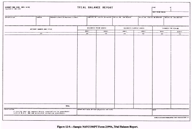 The primary report used to manage these funds is the Trial Balance Report, NAVCOMPT Form 2199A (fig. 12-9). This report must be reviewed to verify that the amount of funds authorized is accurately recorded on the report. To do this, compare your current authorization to the amount shown for the General Ledger Account (GLA) 1031. They should be equal. The amount currently reported as obligations in the GLA 0998 should be reviewed next. This figure should be as current as possible. If you are able to enter your obligations directly into the system, this should not be a problem. Next, review what has been disbursed by looking at the GLA 1060. Within several months after the end of each fiscal year, this should equal the total amount obligated. If this is not the case, determine the reasons for the differences. Finally, determine if there were any problems in liquidating the amounts obligated by looking at the GLA 1960. This will tell you what amounts have been disbursed against your account that have problems (for example, no corresponding obligation or erroneous accounting data). Make sure these problems are promptly corrected. Your responsibilities do not end on 30 September. You must continue to review NAVCOMPT Form 2199A for prior years to make sure the obligations are promptly liquidated and erroneous expenditures are not charged against your operating budget. RECONCILIATION Reconciliation compares what is recorded in your memorandum accounting logbook with what has been recorded in the accounting system. You must reconcile both obligations and expenditures. What makes reconciliation so crucial is that the authorization accounting activity (AAA) records are the official records accepted by higher authority. For this reason they must be correct. Although the responsibility for the error may not be yours, the responsibility for an overobligation is yours. his is why you are responsible for reconciliation, not the AAA. To reconcile you must understand what happens to a voucher after it has been prepared. The original and copies are sent to the disbursing office. A copy is retained in the preparing office for its records and either (1) a copy is sent to the AAA or financial information processing center (FIPC) to record the obligations or (2) an obligation entry is made using your local AAA/FIPC automated system. The Navy Comptroller Manual states that an approved claim authorized by law is an obligation. Therefore, to maintain current obligations, the AAA/FIPC must receive and obligate advance copies of payment vouchers. Then, when a copy of the paid voucher is received from the disbursing officer, the claim payment is removed from the accounts payable and becomes classified as an expenditure. Occasionally an AAA may not receive an advance copy of a payment voucher. In those rare instances, the AAA would have an immediate expenditure. At the end of each month, the AAA uses these entries to generate several accounting reports. One of these reports is the NAVCOMPT Form 2199A. This report gives cumulative figures for your claims authorization. If the cumulative obligtitions shown on the NAVCOMPT Form 2199A equal the cumulative amounts recorded in the memorandum accounting logbook, then they are in balance and reconciliation should normally be the case. Reconcile by job order, First verify that the amount obligated in the job order is accurately reported. Then check the listing of unliquidated obligations to see what obligations have not yet been liquidated. To reconcile, you need two reports from your AAA-a listing of expenditures processed against your authorization and a listing of all outstanding obligations. If you have not received the necessary reports from your AAA and the AAA will not cooperate, JAG should be advised. The AAA is responsible for cooperating in any way possible and responding to any reasonable requests.