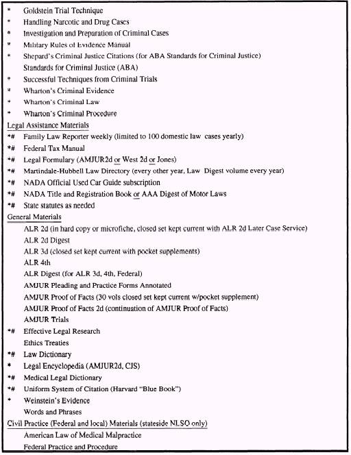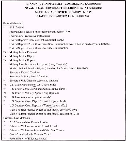 MINIMUM REQUIREMENTS Every law library should contain those legal reference materials that are required for the lawyers using that library to adequately perform the legal research necessary to provide effective service in their areas of responsibility. Even though you will not be primarily responsible for determining what material should be contained in the library, you should be familiar enough with the contents of the library and the demands placed on it for specific research materials to recommend or at least be able to provide a list of books that lawyers should have available for their use when requested. To accomplish this, it may be necessary to ask the lawyers in your office what materials they need. In addition to this, you also should check the standard minimum list of commercial lawbooks that is provided to all field libraries by the Judge Advocate General (JAG). This list, as shown in figure 2-1, is a guide to what is available from JAG. An SJA located near another law library would not need a full collection, whereas an SJA in an isolated location may need a full collection and perhaps more. This standard minimum list does not cover all the legal research materials that may be required by your office. The Head, Field Law Library Section is responsible for providing an initial supply of only those materials on the standard minimum list, but is also
