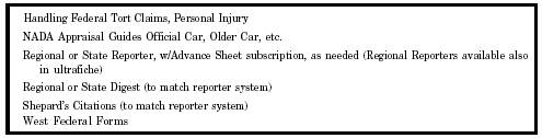 Handling Federal Tort Claims, Personal Injury NADA Appraisal Guides Official Car, Older Car, etc. Regional or State Reporter, w/Advance Sheet subscription, as needed (Regional Reporters available also in ultrafiche) Regional or State Digest (to match reporter system) Shepard's Citations (to match reporter system) West Federal Forms