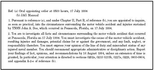 THE INVESTIGATORY BODY An investigation not requiring a hearing may be composed of a single investigator or a board consisting of two or more members. The most common is the one-officer investigation. The IO should normally be a commissioned officer, but may be a warrant officer, senior enlisted, or a civilian employee, when appropriate. IOs must be those individuals who are best qualified for the duty by reason of age, education, training, experience, length of service, and temperament. Unless impractical, the IO should be senior to any person whose conduct or performance of duty will be subject to inquiry. An expert may participate as IO or for the limited purpose of using his or her special experience. The report should make clear any participation by an expert. Ordinarily, counsel is not appointed for an investigation not requiring a hearing, although a judge advocate is often made available to help the IO with any legal problems or questions that may arise. APPOINTING ORDER An investigation not requiring a hearing is convened by a written order called an appointing order. An officer in command is responsible for initiating investigations of incidents occurring within his or her command or involving his or her personnel. An appointing order must be in official letter form, addressed to the IO of the one-officer investigation. When circumstances warrant, an investigation may be convened by an oral or message order. The IO must include the signed, written confirmation of oral or message orders in the investigative report. The written appointing order for a JAGMAN investigation not requiring a hearing will contain the following: 1. Subject line (fig. 13-1) 2. Witness warnings, purpose, and scope of the investigation (fig. 13-2) The paragraphs in figure 13-2 serve several purposes. They recite the specific purpose(s) of the investigation, give explicit instructions as to the scope of the inquiry, and direct the IO to the required witness warnings. These instructions help the IO accomplish all the objects of the investigation, not just the CA's immediate objectives. For example, the following case of a vehicle accident involving a member of the naval service may give rise to various concerns that include (1) the CA who orders the investigation may be concerned whether local procedures regarding the use of government vehicles should be changed and whether disciplinary action may be warranted; (2) JAG maybe concerned with a line of duty/misconduct determination; and (3) the cognizant naval legal service office (NLSO) claims officer will be concerned with potential claims for or against the government. A properly completed investigation requires the 10 to satisfy the special requirements for each of these different determinations. All fact-finding bodies are required, as directed in paragraph 2 of figure 13-2, to make findings of fact. In the typical investigation not requiring a hearing, the appointing order directs the IO to conduct a thorough investigation into all the circumstances connected with the subject incident and to report findings of facts, opinions, and recommendations concerning the following: l The resulting damage l The injuries to members of the naval service and their line of duty and misconduct status l The circumstances attending the death of members of the naval service l The responsibility for the incident under investigation, including any recommended administrative or disciplinary action l Claims for and against the government Any other specific investigative requirements that are relevant, such as those contained in the JAGMAN l During the course of the investigation, on advice of the investigative body or on his or her own initiative, the