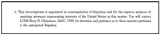 Figure 13-2.-Sample witness warnings, purpose, and scope of investigation. CA may broaden or narrow the scope of the inquiry by issuing supplemental directions amending the appointing order. Paragraph 2 of figure 13-2 also directs the IO to report opinions and recommendations. Unless specifically directed by the appointing order, opinions or recommendations are not made. The CA may require recommendations in general, or in limited subject areas. The appointing order may direct that testimony or statements of some or all witnesses be taken under oath and may direct that testimony of some or all witnesses be recorded verbatim. When a fact-finding body not requiring a hearing takes testimony or statements of witnesses under oath, it should use the oaths prescribed in JAGMAN 0212b. The Privacy Act requires that a Privacy Act statement be given to anyone who is requested to supply personal information in the course of a JAGMAN investigation when that information will be included in a system of records. Note that witnesses will rarely provide personal information that will be retrievable by a witness' name or other personal identifier. Since such retrievability is the cornerstone of the definition of system of records, in most cases the Privacy Act will not require warning anyone unless the investigation may eventually be filed under that individual's name. Social security numbers should not be included in JAGMAN investigation reports unless they are necessary to precisely identify the individuals involved, such as in death or serious injury cases. If a service member or civilian employee is asked to voluntarily provide their social security number for the investigation, a Privacy Act statement must be provided. If the number is obtained from other sources, the individual does not need to be provided with a Privacy Act statement. The fact that social security numbers were obtained from other sources should be noted in the preliminary statement of the investigation. If prosecution for a suspected offense under the UCMJ appears likely, the witness suspected of the offense should be warned under Article 31(b), UCMJ, and JAGMAN 0170. Appendix A-1-m of the JAGMAN shows the proper form to be used. The IO should collect all relevant information from all sources-other than from those persons suspected of offenses, misconduct, or improper performance of duty-before interviewing the suspect. A member of the armed forces, before being asked to provide any statement relating to the origin, incurrence, or aggravation of any disease or injury suffered, should be advised of the statutory right not to make such a statement. Appendix A-2-f of the JAGMAN contains a proper warning format and without this warning the statements are invalid. As figure 13-2 illustrates, all sections of the JAGMAN that may apply to the particular incident under investigation should be listed, along with any applicable chain of command directives. Paragraph 2 of figure 13-2 directs completion of the IO's report within 30 days of the date of the appointing order. JAGMAN 0202c established the following time limits for processing JAGMAN investigations: (a) The CA prescribes the time limit the fact-finding body has to submit its investigation. This period should not normally exceed 30 days from the date of the appointing order; however, this period may be extended for good cause. Always include requests and authorizations for extension as enclosures to the investigation. (b) The CA and each subsequent reviewer have 30 days (20 days in death cases) to review the investigation. Reasons for exceeding these time limits must be documented by the responsible endorser, and deviations must be requested and approved in advance by the immediate senior in command who will next review the investigation. 3. Attorney work product statement (fig. 13-3) Figure 13-3 is an attorney work product statement. This language must be included in the appointing order if the possibility of litigation or a claim for or against the government exists.