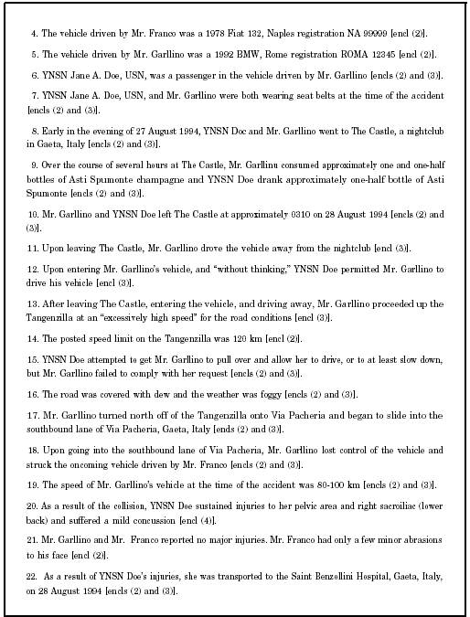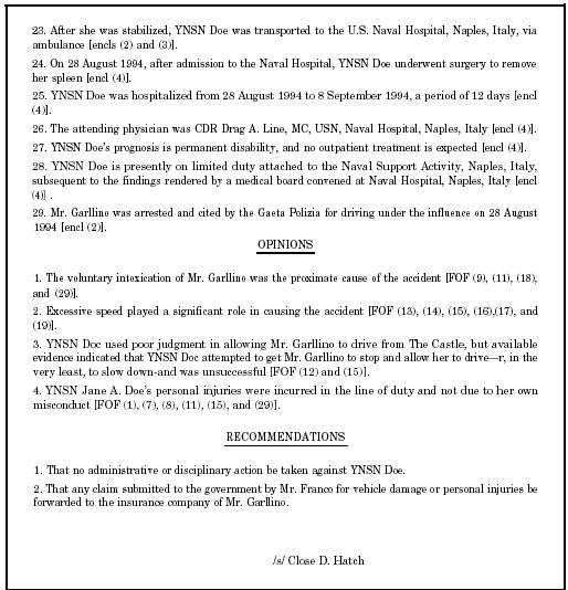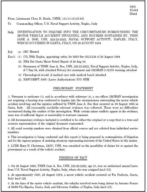 Figure 13-5.-Sample JAGMAN investigation-Continued. If the CA corrects, adds, or disapproves findings of fact, opinions, or recommendation, the following language would be added in the endorsement: . The findings of fact are hereby modified as follows: . The following additional findings of fact are added: (numbers start after the last findings of fact in the basic investigation). l Opinion ____ in the basic correspondence is not substantiated by the findings of fact because and is therefore either disapproved or modified to read as follows: . The following additional opinions are added: (numbers start after the last opinion in the basic investigation). . Recommendation ____ is not appropriate for action at this command; however, a copy of this