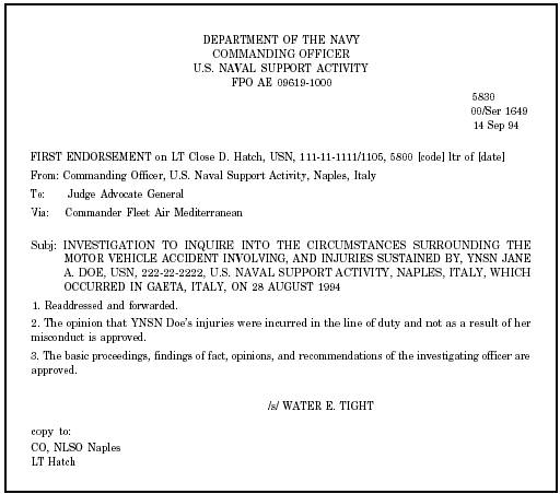 Figure 13-6.-First endorsement of JAGMAN investigative report. investigation is being furnished to __________________ for such action as deemed appropriate. . Additional recommendations: (numbers start after the last recommendation in the basic investigation). . The action recommended in recommendation ____ has been accomplished by (has been forwarded to for action). If corrective action had been taken on the investigation, paragraph 4 of figure 13-6 would read: 4. Subject to the foregoing remarks, the basic proceedings, findings of fact, opinions, and recommendations of the investigating officer are approved. |