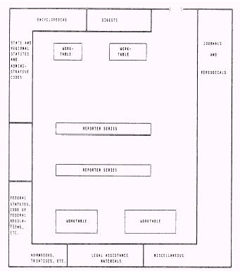 Figure 2-4.-Library layout for small- or medium-sized library. specific areas of law, such as military justice, legal assistance, and claims, should be kept in the spaces of the division primarily concerned with those specific areas. Even though some of the materials contained in the library are located in various offices, there are certain materials that should be kept in a central location. These include such materials as finding tools, reporters, and certain sets containing statutes. A definite arrangement is needed in the central library for these particular materials to help you and those individuals using the library to locate specific References quickly and easily. The arrangement of the materials kept in separate offices should be left up to the individuals controlling those offices. However, the accountability for these materials is still your responsibility since they are part of the law library. Legal research frequently entails the use of several books simultaneously. Observe someone researching the law and you will see that person find a point of law in one book, then obtain another book to help develop that point, then refer to another book to develop it further, and so on until that person has refined it to its most effective point. This process involves the examining of a law from many varied sources. The physical arrangement of the library should be established in a manner that will permit the researcher to reach each of these books with a minimum of wasted motion. Space and equipment limitations will dictate the most effective layout for your library. Figures 2-3 and 2-4 show two sample arrangements. The following suggestions may be helpful to you in determining the arrangement of the materials in your library. . Organization by major subject-In some libraries, the books are shelved in groups based on their major subject content (military justice, criminal law, or admiralty law). l Organization by type of publication-This involves the arrangement of the materials by the type of publication, such as encyclopedias, journals, treatises, statutes, and reports. Either of these methods is effective or as an alternative, a combination of these methods may be used in arranging the materials in the library. Whenever you use one of these suggested methods or some other method of your own design, you should first take a look at what types of materials are contained in the library and then make a determination as to which method or methods would work best. MAINTENANCE PROCEDURES The importance of properly filing, updating, and accounting for the materials contained in the library cannot be overemphasized. This should be accomplished immediately upon receipt (or upon completion of office routing) of any new materials. There can be no excuse for an error caused by using an out-of-date lawbook when the update is sitting off in a corner. The following hints are given to help make your job easier in these areas. Filing As you begin working with the various types of materials contained in the law library, you will discover that the publishers of these materials have designed the format of each publication to allow for frequent and continuous updating. This is necessary to keep up with the constant changes that occur in the laws that govern our states and country. The methods used to update these materials vary with each publisher, but the most common ones that you will work with are loose-leaf supplements, pocket parts, interim pamphlets, advance sheets, bound volume replacements, and hound volume supplements. Because of these variances, you should carefully read any instructions the publishers have prepared about the proper methods to make changes and updates to their published materials. Let's take a look at these seven methods and see how they are used to keep the materials in your library up to date. . Loose-leaf supplements-As the name implies, these materials are loose-leaf and are usually kept in special binders previded by the publisher. U.S. Law Week, published by the Bureau of National Affairs (BNA), and the Military Law Reporter, published by Public Law Education Institute, are examples of looseleaf services you may find in the library. U.S. Law Week is designed to keep lawyers current on selected new laws, regulatory agency interpretations of new and existing laws, and recent opinions of the U.S. Supreme Court and lower federal courts. The Military Law Reporter is designed to keep military lawyers current on selected new laws, regulations, and directives of the armed forces, and recent opinions of the U.S. Court of Military Appeals and the published and unpublished opinions of the Army, Air Force, and Navy Courts of Military Review. You should file these loose-leaf supplements as soon as possible after receipt. Special emphasis should be placed on following the filing instructions-this may appear time-consuming but is often the quickest method to make sure the loose-leaf service is properly maintained. . Pocket parts-These supplements are published periodically (usually annually) and are designed to fit into a pocket provided by the publisher inside the book cover of the bound volume for which the pocket part has been printed. The U.S. Code Annotated (U. S.C.A.), published by West Publishing Company, uses the pocket part system. It is important, when filing pocket parts, to make sure each pocket part is placed in the proper volume and the outdated pocket part is discarded. . Supplementary pamphlets-These are sometimes published as an alternative or an addition to a pocket part. They should normally be shelved beside the volume(s) they supplement. Instructions on the pamphlets will inform you of whether or not you should discard the pocket parts. The U.S.C.A. usually contains several supplementary pamphlets at any given time. . Interim pamphlets-These are published at various times, usually to update a set between issuance of annual pocket parts or other periodic updates. For 
