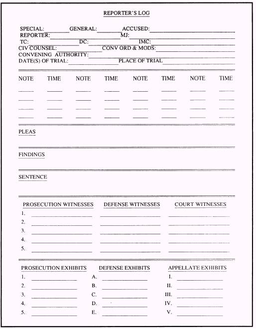 SHORTHAND Shorthand is a more efficient method of recording than longhand because it uses abbreviations, symbols, and characters in the place of letters, words, and phrases in recording what is being dictated. The only equipment needed for this method is pencils and paper. MULTICHANNEL TAPE RECORDER The use of a multichannel tape recorder can guarantee that everything said during a particular proceeding is recorded. The major drawback of this method is that the individuals speaking may not be readily identified when the recording is transcribed and gestures and other nonverbal actions are not recorded at all. The use of a multichannel tape recording system has been found to be useful as a primary system with the incorporation of the reporter notes to add in the missing elements of speaker identification and nonverbal responses and gestures. REPORTER'S LOG During the proceedings of an SPCM or a GCM, the reporter is responsible not only for recording verbatim the proceedings of the court but also for noting in the record such items as the stages of examination; time of opening, recessing, closing, and adjournment of the court; and the marking of exhibits. The reporter's log, Figure 3-1, can be a great aid to you both during and after the court. Use this log in any court-martial you record. The log has a place to fill in all the pertinent data that you will need to help in the transcription of the record of trial. GENERAL RECORDING INFORMATION AND REPORTING TIPS In the following paragraphs, you will find some tips to help you produce records of trial that will be consistent and uniform in format. General information on such items as margins, page numbering, abbreviations, grammar, and punctuation is included. Taking a few minutes now to familiarize yourself with these basic rules will save you much time in the future and also enable you to turn out a funished product ready for immediate review. The following information relates primarily to SPCMs and GCMs. We will discuss the preparation of SCM records later in this chapter. MARGINS The left margin of th record of trial should be 1 inch (10 picas or 12 elite spaces). The right margin should be set 1/2 inch from the side of the page (5 picas or 6 elite spaces.) The top margin on all pages should be 2 1/2 inches (15 lines) to allow room for binding with ACCO fasteners. The bottom margin on all pages should end as close to 1 inch (but not more than 2 inches) from the bottom of the page as possible. If the typed text ends more than 2 inches from the bottom of the page, as when it has been necessary to insert an additional partial page of testimony, you must draw a diagonal line from the left margin, starting immediately under the last line of typing to the right margin 1/2 inch from the bottom of the page. The reason for this action is to make the reviewing authorities aware that nothing has been inadvertently omitted from the record.