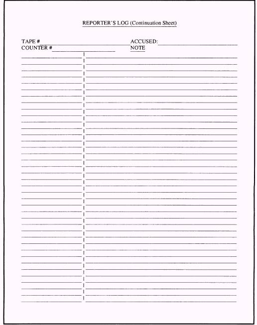 Figure 3-1.-Reporter's log-Continued. Indent two spaces from the left margin for each prefix; for example, TC, DC, PRES, ACCUSED, WITNESS, Q, and A. The second and subsequent lines should be typed flush with the left margin. Examples are as follows: TC: I object to the last question of the defense on the grounds that it calls for an opinion on the part of the witness. Q. Could you please relate, to the members of the court, the circumstances surrounding the burglary on the evening in question? |