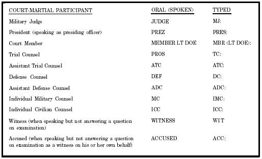 COURT-MARTIAL PARTICIPANT ORAL (SPOKEN) TYPED Military Judge JUDGE MJ: President (speaking as presiding officer) PREZ PRES: Court Member MEMBER LT DOE MBR (LT DOE): Trial Counsel PROS TC: Assistant Trial Counsel ATC ATC: Defense Counsel DEF DC: Assistant Defense Counsel ADC ADC: Individual Military Counsel MC IMC: Individual Civilian Counsel ICC ICC: Witness (when speaking but not answering a question WITNESS WI T on examination) Accused (when speaking but not answering a question ACCUSED ACC: on examination as a witness on his or her own behalf)