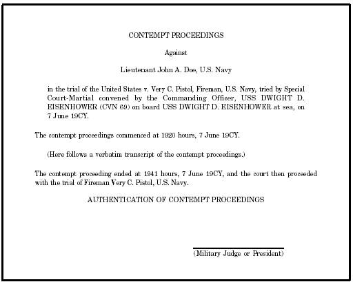 CONTEMPT PROCEEDINGS Against Lieutenant John A. Doe, U.S. Navy in the trial of the United States v. Very C. Pistol, Fireman, U.S. Navy, tried by Special Court-Martial convened by the Commanding Officer, USS DWIGHT D. EISENHOWER (CVN 69) on board USS DWIGHT D. EISENHOWER at sea, on 7 June 19CY. The contempt proceedings commenced at 1920 hours, 7 June 19CY. (Here follows a verbatim transcript of the contempt proceedings.) The contempt proceeding ended at 1941 hours, 7 June 19CY, and the court then proceeded with the trial of Fireman Very C. Pistol, U.S. Navy. AUTHENTICATION OF CONTEMPT PROCEEDINGS (Military Judge or President)