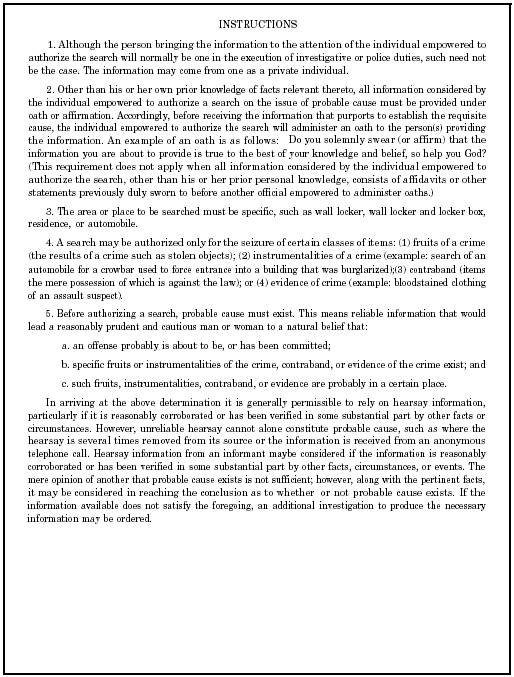 DELEGATION OF THE POWER TO AUTHORIZE SEARCHES.- Traditionally, commanders have delegated their power to authorize searches to their chief of staff, command duty officer (CDO), or even the officer of the day (OOD). This practice was held to be illegal, as the Court of Military Appeals has held that a CO may not delegate the power to authorize searches and seizures to anyone except a military judge or military magistrate. The court decided that most searches authorized by delegees such as CDOs would result in unreasonable searches or seizures in violation of the Fourth Amendment. If full command responsibility devolves upon a subordinate, that person may authorize searches and seizures since the subordinate in such cases is acting as the CO. General command responsibility does not automatically devolve to the CDO, OOD, or even the executive officer (XO) simply because the CO is absent. Only if full command responsibilities devolve to a subordinate member of the command may that person lawfully authorize a search. If, for example, the CDO or OOD must contact a superior officer or the CO before acting on any matter affecting the command, full command responsibilities will not have devolved to that person and, therefore, he or she could not lawfully authority a search or seizure. Guidance on this matter has been issued by the Commander in Chief Atlantic Fleet (CINCLANTFLT), Commander in Chief Pacific Fleet (CINCPACFLT), and Commander in Chief U.S. Naval Forces, Europe (CINCUSNAVEUR). Until the courts provide further guidance on this issue, you should follow the guidance set forth by your respective CINCs. THE REQUIREMENT OF NEUTRALITY AND DETACHMENT.- A commander must be neutral and detached when acting on a request for search authorization. The courts have issued certain rules that, if violated, will void any search authorized by a CO on the basis of lack of neutrality and detachment. These rules are designed to prevent an individual who has entered the evidence gathering process from thereafter acting to authorize a search. The intent of both the courts' decisions and the rules of evidence is to maintain impartiality in each case. When a commander has become involved in any capacity concerning an individual case, the commander should carefully consider whether his or her perspective can truly be objective when reviewing later requests for search authorization. If a commander is faced with a situation in which action on a search authorization request is impossible because of a lack of neutrality or detachment, a superior commander in the chain of command or another commander who has jurisdiction over the person or place should be asked to authorize the search. THE REQUIREMENT OF PROBABLE CAUSE.- As discussed earlier, the probable cause determination is based upon a reasonable belief that a crime was committed and certain persons, property, or evidence related to that crime will be found in the place or on the persons to be searched. Before a person may conclude that probable cause to search exists, he or she should have a reasonable belief that the information giving rise to the intent to search is believable and has a factual basis. The portion of Mil.R.Evid. 315 dealing with probable cause recognizes the proper use of hearsay information in the determination of probable cause and allows such determinations to be based either wholly or in part on such information. Probable cause must be based on information provided to or already known by the authorizing official. Such information can come to the commander through written documents, oral statements, messages relayed through normal communications procedures such as the telephone or by radio, or may be based on information already known by the authorizing official. In all cases, both the factual basis and believability basis should he satisfied. The factual basis requirement is met when an individual reasonably concludes that the information, if reliable, adequately apprises him or her that the property in question is what it is alleged to be and is located where it is alleged to be. Information is believable when an individual reasonably concludes that it is sufficiently reliable to be believed. The method of application of the tests will differ, however, depending upon circumstances. The following examples are illustrative: l An individual making a probable cause determination who observes an incident firsthand must determine only that the observation is reliable and that the property is likely to be what it appears to be. For example, an officer who believes that he or she sees an individual in possession of heroin must first conclude that the observation was reliable; for example, whether his or her eyesight was adequate and the observation was long enough, and that he or she has sufficient knowledge and experience to be able reasonably to believe that the substance in question is in fact heroin. . An individual making a probable cause determination who relies upon the in-person report of an informant must determine both that the informant is believable and that the property observed is likely to be what the observer believes it to be. The determining individual may consider the demeanor of the informant to help determine whether the informant is believable. An individual known to have a clean record and no bias against the suspect is likely to be credible. . An individual making a probable cause determination who relies upon the report of an informant not present before the authorizing official must determine both that the informant is believable and that the information supplied has a factual basis. The individual making the determination may use one or more of the following factors to decide whether the informant is believable. Prior record as a reliable informant-Has the informant given information in the past that proved to be accurate? Corroborating detail-Has enough detail of the informant's information been verified to imply that 