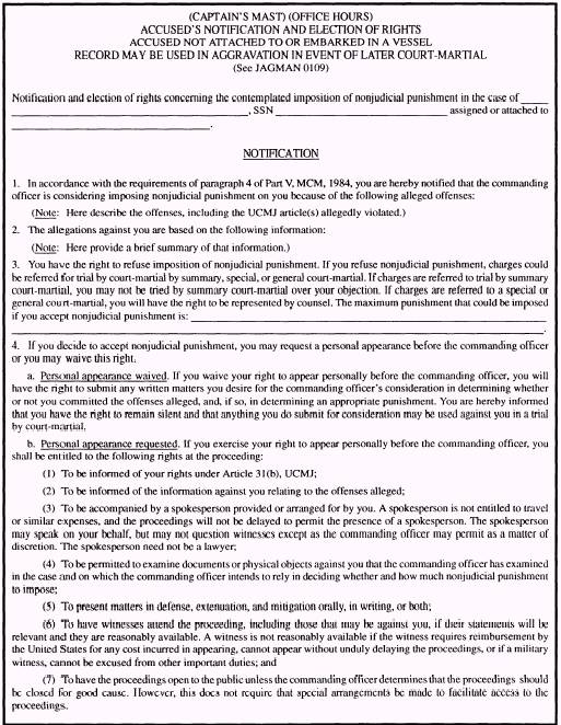 Figure 5-6.-Accused's notification and election of rights. Accused not attached to or embarked in a vessel. Record may be used in aggravation in event of later court-martial-Continued.remember that an accused not attached to or embarked in a vessel may elect at any time before imposition of NJP to refuse it and demand a court-martial. It is, then, possible for an accused to elect not to demand trial by court-martial at the XO's screening but later at captain's mast demand it provided it is before any punishment is imposed. Once the XO has conducted an inquiry, he or she has the option of referring the case to mast or dismissing it. The XO fills in section F of figure 5-1 noting the action he or she has taken. If the case is referred to the CO for mast, a formal hearing is set up. |
