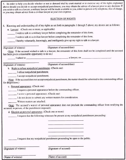 Figure 5-5.-Accused's notification and election of rights. Accused not attached to or embarked in a vessel. Record cannot be used in aggravation in event of later court-martial unless lawyer serves as personal representative-Continued.