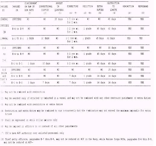 Figure 5-8.-Limits of punishments under UCMJ, Article 15. POSSIBLE ACTIONS BY THE CO AT MAST Dismissal with or without warning -this action is taken if the CO is not convinced by the evidence that the accused is guilty of an offense or decides that no punishment is appropriate in light of the accused's record and other circumstances. Dismissal, whether with or without a warning, is not considered NJP, nor is it considered an acquittal. Referral to an SCM, SPCM, or a pretrial investigation under Article 32, UCMJ -the CO may in his or her sole discretion, refer the charge(s) to an SCM, an SPCM or an Article 32 investigation. This will, of course, depend upon the severity of the charges. Postponement of action -the CO can postpone any action on the NJP pending further investigation or for other good cause, such as a pending trial by civil authorities for the same offense. Imposition of NJP -the CO may impose NJP and award any of the authorized punishments outlined in part V, par. 5, MCM.