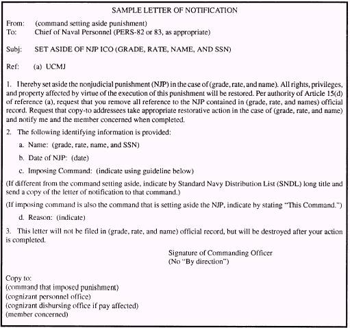 Figure 5-9.-Sample letter of notification. MILPERSMAN, Article 2230200, limiting advancement to a rate formerly held only after a minimum of 12 months' observation of performance. Such action can be taken with respect to the whole or a part of the punishment imposed. All entries on the punishment set aside are removed from the service record of the accused. Refer to the MILPERSMAN, Article 5030500. According to the MILPERSMAN, Article 5040110, once a punishment is set aside, the CO prepares and personally signs (no By direction signature is allowed) a letter of notification as shown in figure 5-9. This letter is sent to the Chief of Naval Personnel (PERS-82 for officers and PERS-83 for enlisted) to make sure all local records are purged of any notation of the NJP and its residual effects. PERS-82 or 83, as appropriate, identifies the documents to carry out the actions authorized by the CO and directs PERS-313D to remove all References to the matter from the microfiche record. PERS-82 or 83 will notify the CO and the member when the action has been completed. |