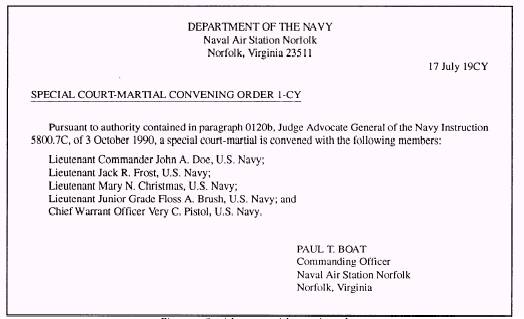 Distribution Requirements With one accused prepare at least an original and six copies of the charge sheet. You will distribute them as follows: 1. Original-For insertion in the original record of trial 2. Copies to-TC, DC, military judge, accused, court reporter, and the file This is a recommended distribution. Numbers may vary depending upon local practices. CONVENING AND AMENDING ORDERS Courts-martial are convened by means of a convening order issued by the CA, The convening order must be personally signed by the CA. Without a convening order, no court-martial can be held, with one exception; the exception is when only one officer is attached to a command. In this case, he or she is the SCM of the command and no order detailing him or her is needed. A court is usually created to hear several cases, but may in fact hear only one. In detailing a new court, the old court should not be dissolved nor should the old convening order be rescinded or revoked. One good reason for this is if the court that heard a case that was returned for proceedings in revision has been dissolved there can be no proceedings in revision. Circumstances will determine whether a new court will be convened to hear the case or whether the case will be referred to an existing court. In the first instance, there will be a new convening order prepared. In the latter, a current convening order maybe used, or it may be amended as necessary. Amendments may become necessary when there is an insufficient number of officer members available or when the court may be reduced below a quorum, or when the assignment of enlisted members is required according to the request of an enlisted accused. Preparation A convening order for a GCM or an SPCM will designate the type of court-martial and detail the members and may also designate where the court-martial will meet. If the CA has been designated by the secretary concerned, the convening order will state this. Refer to appendix 6 of the MCM for forms for orders convening courts-martial. Figure 6-2 illustrates a convening order for an SCM. Figure 6-3 shows a convening order for an SPCM. Figure 6-4 shows a convening order for a GCM. The members, military judge, and counsel may be changed by an authority competent to detail such persons. Changes of the members of the court-martial should be kept to a minimum. If extensive changes are necessary and no session of the court-martial has begun, it may be appropriate to withdraw the charges from one court-martial and refer them to another. When new persons are added as members or counsel or when substitutions are made as to any members or counsel or the military judge, such persons are detailed in the same manner as original members. An order changing the members of the court-martial, except one that excuses members without replacements, is reduced to writing and is called an amending order. Figure 6-5 shows an SPCM amending order permanently adding officer members to a previously established court. Figure 6-6 shows an SPCM amending order temporarily adding officer members to a previously established court for a