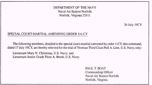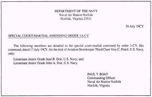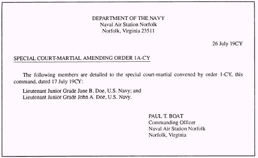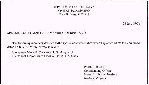 Figure 6-6.-Special court-martial amending order temporarily adding officer members to a previously established court for a specific case only. specific case only. Figure 6-7 shows an SPCM members from a previously established court without amending order used to permanently remove officer replacement members. Figure 6-8 shows an SPCM