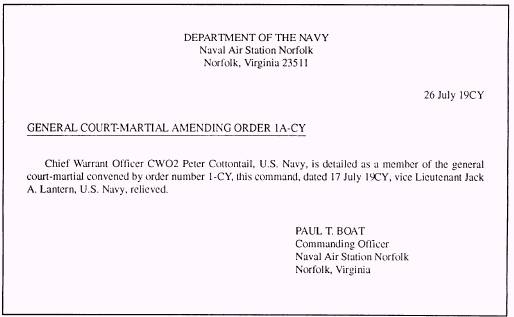 Figure 6-9.-General court-martial amending order permanently removing an officer member from a previously established court and replacing that member with a new officer member. stipulation as to one or more charges and specifications and to fulfill such additional terms or conditions that may be included in the agreement and that are not prohibited and (2) a promise by the CA to do one or more of the following: (a) refer the charges to a certain type of court-martial; (b) refer a capital offense as noncapital; (c) withdraw one or more charges and specifications from the court-martial; (d) have the TC present no evidence as to one or more specifications or portions thereof; and (e) take specified action on the sentence adjudged by the court-martial. Pretrial agreements may be entered into in both GCMs and SPCMs. No provision exists for entering into a pretrial agreement in SCMs. Pretrial agreement negotiations may be initiated by the accused, DC, TC, SJA, and CA, or their duly authorized representatives. Either the defense or the government may propose any term or condition not prohibited by law or public policy, Government representatives negotiate with the DC unless the accused has waived the right to counsel. In GCMs, the TV works through the CA's SJA in making his or her recommendations about the offer to the CA. However, in SPCMs, this procedure is not required if the CA has no SJA. After negotiations, if the accused elects to propose a pretrial agreement, the defense submits a written offer. All terms, conditions, and promises between the parties are contained in this offer. The proposed agreement is personally signed by the accused and DC, if any. If the agreement contains any specified action on the adjudged sentence, that action will be set forth on a page separate from the other portions of the agreement. The CA may either accept or reject an offer of the accused to enter into a pretrial agreement, or may propose by a counteroffer any terms or conditions not prohibited by law or public policy. The decision whether to accept or reject an offer is within the sole discretion of the CA. When the CA has accepted a pretrial agreement, the CA, or an authorized representative such as the SJA or the TC, signs the agreement. The accused may withdraw from a pretrial agreement at any time. The CA may withdraw from a pretrial agreement under the following circumstances: (1) any time before the accused begins performance of promises contained in the agreement, (2) upon the failure by the accused to fulfill any material promise or condition in the agreement, (3) when inquiry by the military judge discloses a disagreement as to a material term in the agreement, or (4) if findings are set aside because a pica of guilty is held improvident on appellate review. A suggested form for such an agreement for GCMs and SPCMs is shown in figure 6-10. See also appendix A-1-h of the JAG Manual for an example of a pretrial agreement. You must modify the format of the agreement as necessary to include all the terms of the agreement made between the accused and the CA. No matters that are "understood" between the accused and the CA should be omitted from the written agreement. Except in an SPCM without a military judge, no member of a court-martial may be informed of the existence of a pretrial agreement. In addition, the fact that an accused offered to enter into a pretrial agreement and any statements made by an accused in connection with that offer, whether during negotiations or during the providence inquiry, may not be disclosed to the members. Also, the court may not be informed of any such agreement made and later rejected by the accused who has decided to plead not guilty at trial. You should use caution to prevent the court from obtaining any unofficial knowledge of the negotiation for, or existence of, a pretrial agreement. However, the military judge is authorized to examine the pretrial agreement in those cases that he or she sits with members. The military judge is not authorized to examine or inquire into that part of the agreement that states the specific sentence agreed upon by the accused and CA in those cases that the military judge hears alone (without members). The existence of a pretrial agreement does not prevent the accused from presenting matter in mitigation and extenuation. Counsel for the accuscd also has a continuing duty, in spite of a pretrial agreement, to vigorously represent the accused before the court with respect to the sentence to be adjudged. Actually, the accused benefits in two ways by entering into a pretrial agreement. First, if the court adjudges a greater sentence than provided for in the pretrial agreement, the CA must reduce the sentence according to the terms of the agreement. However, if the court adjudges a lesser sentence than provided for in the pretrial agreement, the CA may not increase the sentence as provided for in the agreement and the accused must only serve the lesser sentence as adjudged by the court. Further information on pretrial agreements is contained in the JAG Manual.