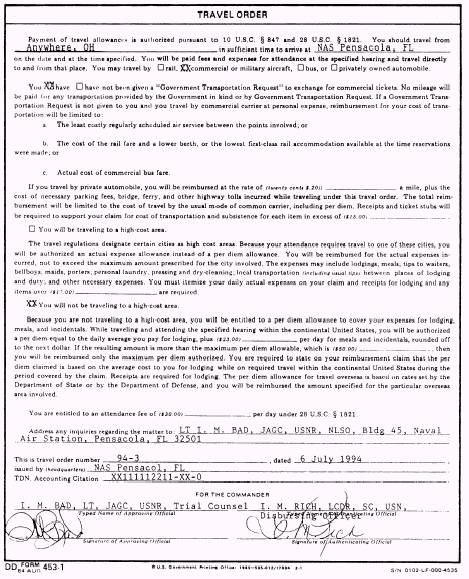 Figure 6-16.-Sample DD Form 453-1, Travel Order. will grant leave or liberty to the person provided such absence will not prejudice the best interests of the naval service. If the member is being called as a witness for a nongovernmental party only because of performance of official duties, the CO is authorized to issue the member permissive orders at no expense to the government. FLYERS, WORKSHEETS, SEATING CHARTS, FORM FOR QUESTIONS BY COURT MEMBERS Depending upon your job assignment, you may be required to prepare some or all of these additional pretrial paper work matters. Some are prepared by the court reporter and some by defense or trial paralegals. However, it is essential that you have an understanding of these important pretrial matters. Flyers When you type a flyer, list only those charges and specifications that will be before the members. Check with the TC before typing because there might be changes to the charges and specification that you are not aware of. The flyer is prepared from the charge sheet before the initial Article 39(a) session and contains all pending charges and specifications. The renumbering of specifications that you provide to the members during preliminary instructions or voir dire in partial or mixed plea cases is not required because of the administrative problems and needless confusion that would be created. Instruct the members that they are not to speculate as to why the charges and specifications are numbered as they are. Use two separate flyers-one listing only charges and specifications to be litigated on findings and the other reflecting all the charges and specifications to be presented to the members for sentencing. If, in such circumstance, the DC desires to inform the members of guilty plea specifications, the record will show that the military judge asked for the views of both counsel and that the DC chose to do so for tactical considerations. If a motion to dismiss or motion for appropriate relief is granted and the charges are amended before the seating of the panel, prepare a new flyer to reflect the amended charges. The panel members will receive only those specifications and charges that the accused is to be tried on. Figure 6-17 shows a sample flyer. |