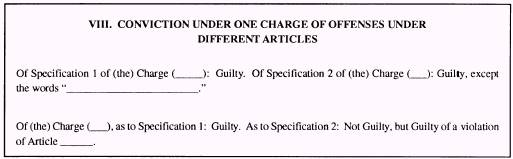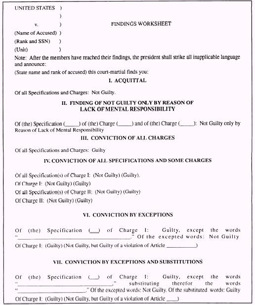 The MCM discusses the findings worksheet in R.C.M. 921, "Discussion." Ordinarily, a findings worksheet is provided to the members as an aid to putting the findings in proper form. If the military judge examines any writing by the members, or otherwise helps them to put findings in proper form, this is done in open session and counsel is given an opportunity to examine such a writing and to be heard on any instructions the military judge may give. The findings worksheet is designed to assist the president of a court-martial to properly announce the findings of the court-martial in open session. During an Article 39(a) session, before instructions and argument on findings, counsel for both sides and the military judge decide whether or not they feel that a lesser included offense contained within the charged offenses has been raised during the trial. After this Article 39(a) session, if required, a modified findings worksheet is prepared to reflect the decision of the court as to possible exceptions and substitutions or violations of offenses other than those charged. The findings worksheet is generally prepared by the TC who should take care that it is tailored to the individual case. (Format for findings is shown in appendix 10 of the MCM.) A sample findings worksheet is shown in figure 6-18. The worksheet is marked as in appellate exhibit and attached to the record of trial. In preparing the worksheet, each specification is addressed individually, as well as the charge. It is proper to allow for acquittal of all charges and specifications before allowing for conviction of all charges and specifictions. This is also true for allowing the members to select Not Guilty before Guilty so as not to show prejudice toward the guilt of the accused. If the accused pled to a lesser included offense, the members must be informed of that plea since it admits some essential elements that the government would otherwise have to prove. Do not enter findings in a member's trial on a lesser included offense plea unless the prosecution does not intend to prove the greater offense. If members will decide between the greater and lesser offense, then tailor the worksheet to limit their findings to those choices.