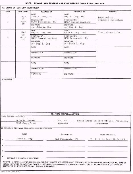 To admit lawfully seized items in evidence at trial they must be authenticated. That is, it must be shown that they are what they purport to be. Sheer administrative convenience dictates that all evidence seized be tagged to indicate the following: l Date and time of seizure l Location of article when discovered l Identification of person, if any, from whom the property was taken l Name of person seizing evidence l Name of suspect(s) against whom the evidence may be used The problem in getting evidence admitted, then, is one of proving to the court that the evidence offered is precisely the same evidence as was seized. Dependent upon the characteristics of the evidence, in-court identification may be made by either of two means, and how you handle the evidence will depend on what method of in-court identification is contemplated. If the evidence has a peculiar identifying feature, one familiar with that feature may identify the evidence by that feature in court. The use of a serial number to identify a typewriter is an example of this method of identification. Your sole concern with such evidence is to guarantee its presence in court, and this is done by providing physical security until the trial. Evidence that does not have such an identifying feature must be treated with greater care. Suspected marijuana cigarettes are an example of this kind of evidence. To demonstrate that the proffered evidence is the same as that seized, the TC will have to show a chain of custody from the time of seizure until the time of trial. The TC will prove his or her evidence by calling a succession of witnesses beginning with the person who made the seizure and ending with the person who delivers the evidence to the court. Each witness will testify how he or she got the evidence; what, if anything, he or she did with it; and to whom he or she delivered it. The necessity of limiting access to the evidence and of keeping a record of those who have had control over the evidence is obvious. RECEIPT.- The Evidence/Property Custody Document, OPNAV 5527/22, is used as the official record of receipt, chain of custody, and final disposition of items of physical evidence. The form normally is prepared with an original and three copies. Entries should be typed or printed in ink. The last or third copy is used as a receipt when evidence is received from an individual. The original and other two copies are presented to the evidence custodian who maintains the original and first copy. The second copy is returned to the investigator (master-at-arms [MAA] or Naval Criminal Investigative Service [NCIS]) for submission of the evidence for inclusion in the case file. An example of a completed evidence custody document is shown in figures 6-23A and 6-23B. SAFEGUARDING.- Each individual in the chain of custody is responsible for the care, safekeeping, and preservation of items of evidence. Because of the sensitive nature of evidence, an evidence custodian assumes responsibility for the evidence when not in use by you or other competent authority involved in the investigation, such as the TC. The evidence custodian must be a commissioned officer, warrant officer, or an enlisted person E-6 or